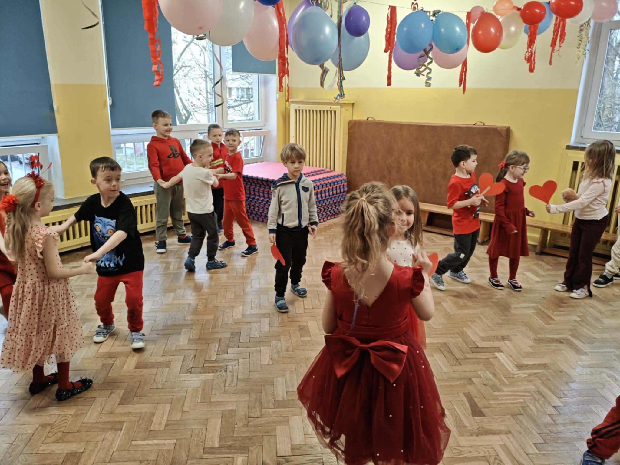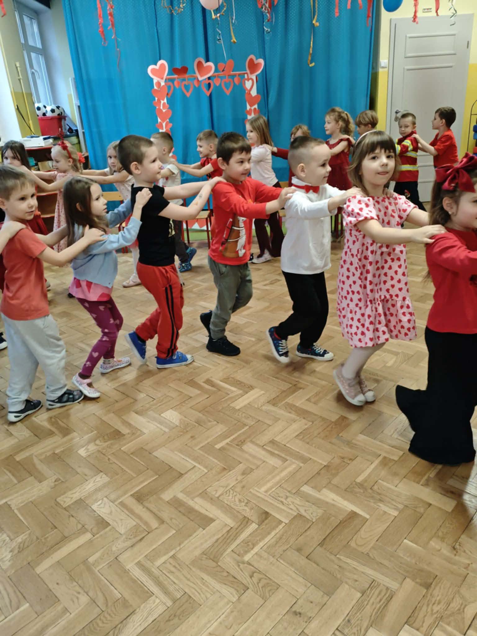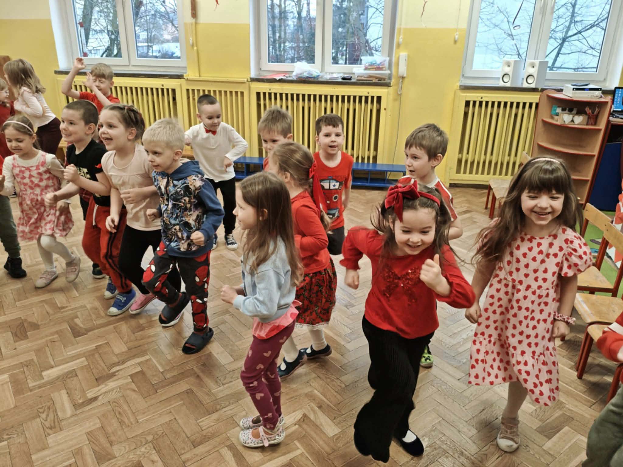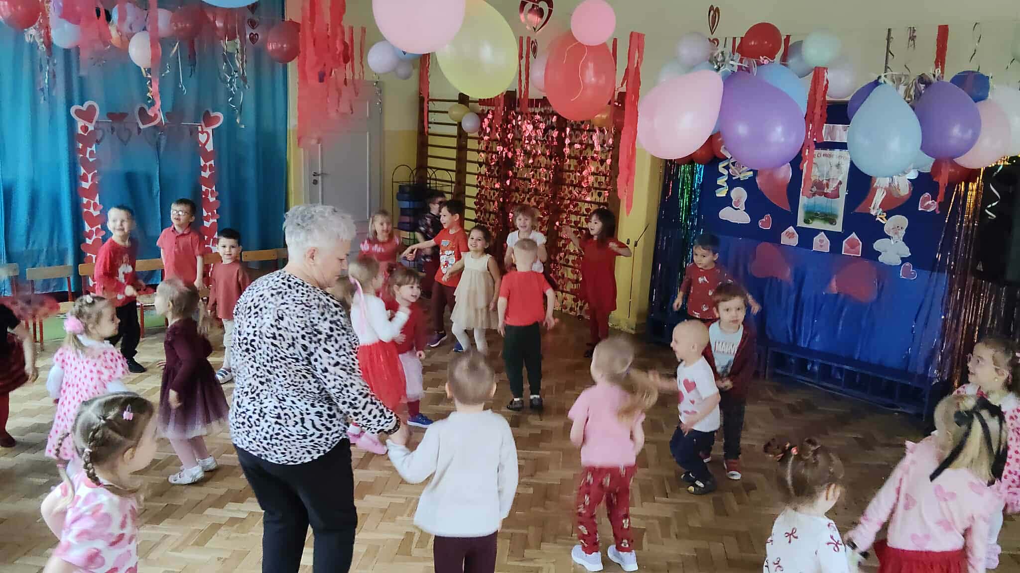 Dziś w naszym przedszkolu odbył się bal walentynkowy z okazji nadchodzącego święta- Świętego Walentego. Tego dnia było bardzo czerwono, a to za sprawą przedszkolaków ubranych w ten charakterystyczny dla Walentynek kolor, a także wystroju przedszkola, w którym dominowały czerwone serca. Podczas balu przedszkolaki tańczyły, brały udział w różnych zabawach integracyjnych takich jak: układanie serduszkowych puzzli, rysowanie palcem po piasku, układanie serc z kolorowych szarf, plastikowych nakrętek, dzieci grały na instrumentach muzycznych tańczyły walca. Dzisiejszy bal to nie tylko dobra zabawa, ale także okazja do nauki okazywania uczuć, współpracy i budowania pozytywnych relacji między dziećmi. To dzień pełen radości, śmiechu i serdecznej atmosfery, który na długo pozostaje w pamięci przedszkolaków.