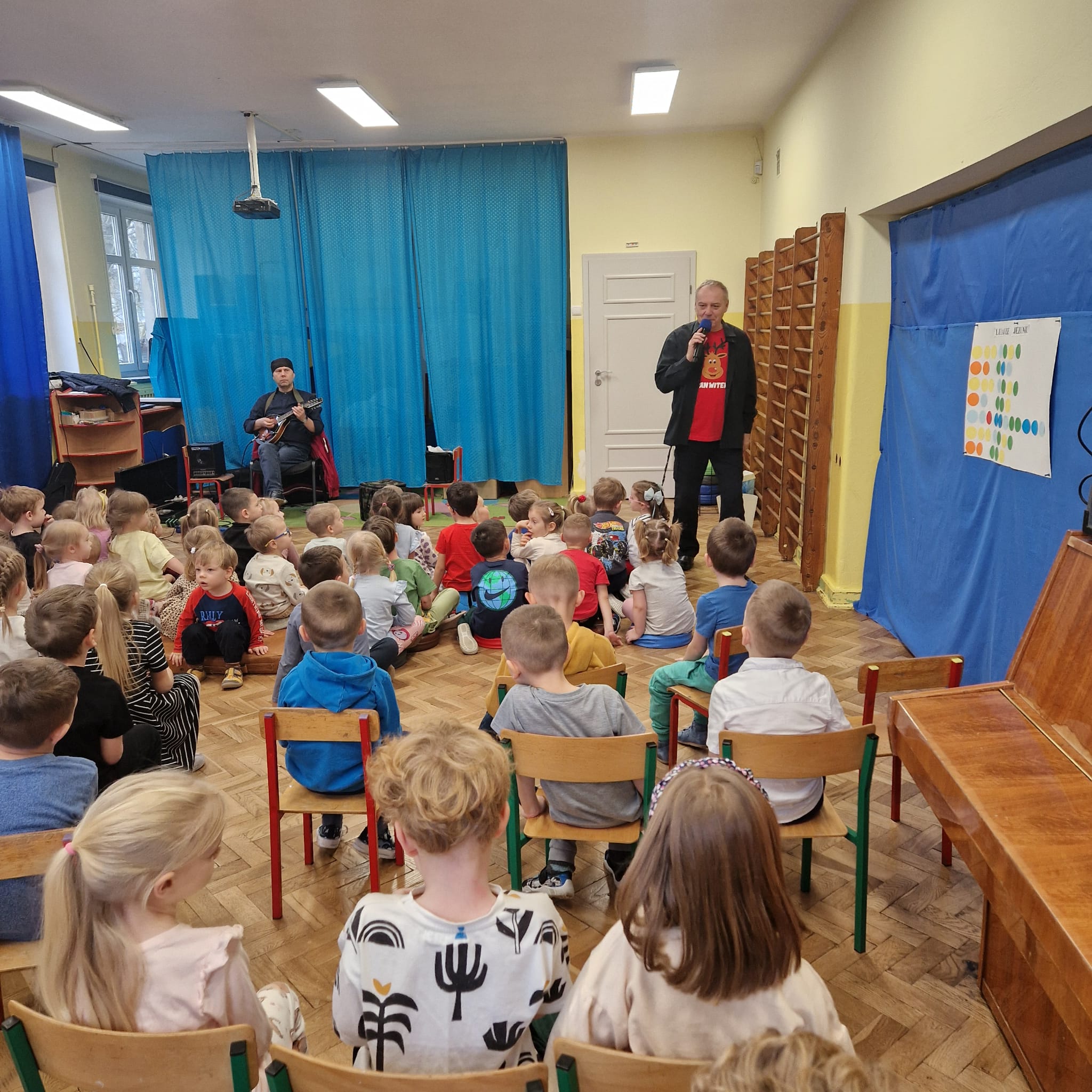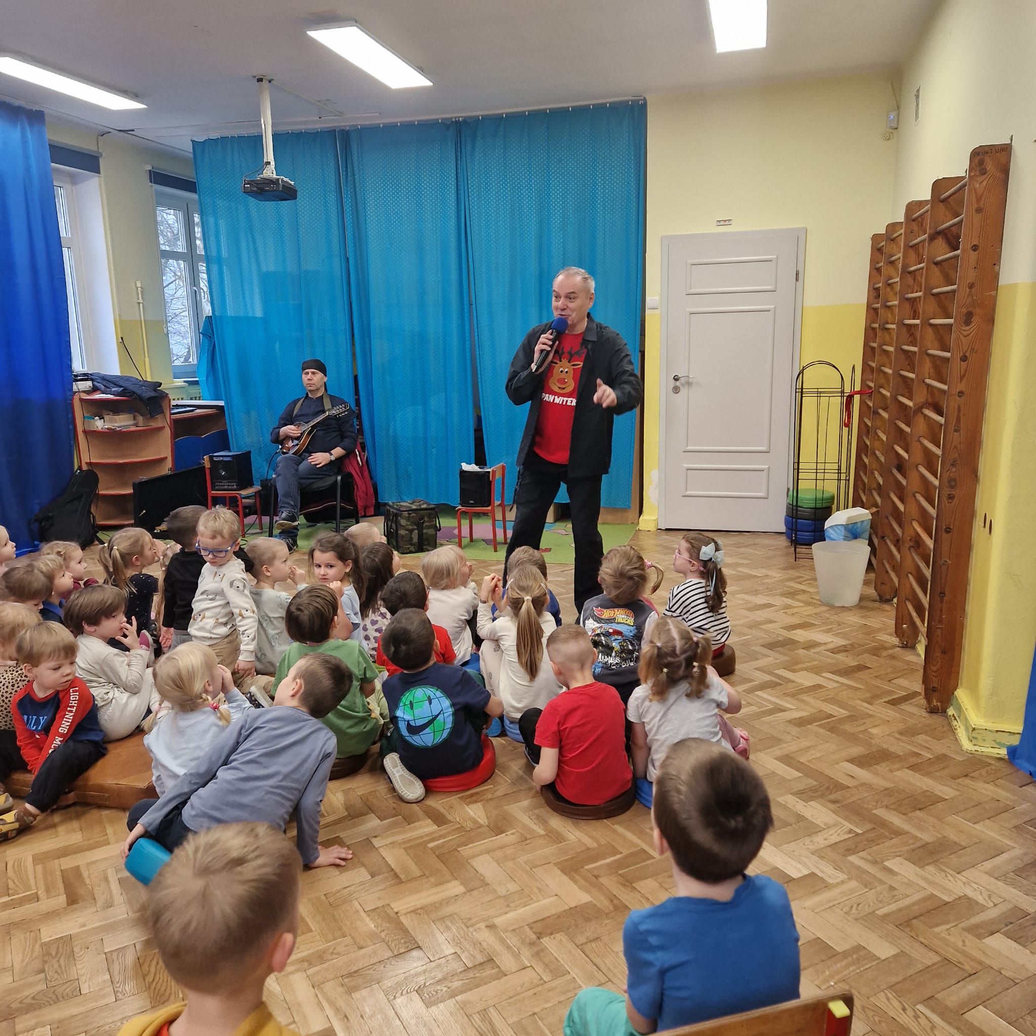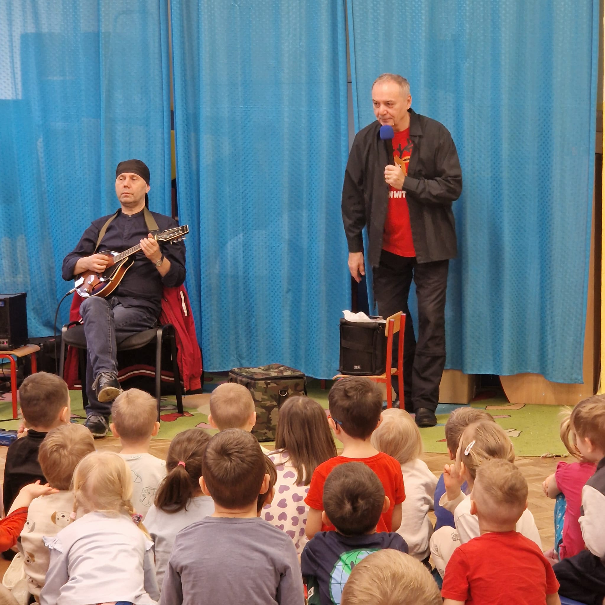 Dziś odbyło się grudniowe spotkanie muzyczne pod hasłem „Kiedy zacznie padać?”. Koncert poprowadził dobrze znany i lubiany Pan Witek. Na początku dzieci zaśpiewały piosenkę powitalną. Gościem dzisiejszego koncertu był Pan Leszek, który zaprezentował dzieciom jak wygląda i brzmi instrument strunowy o nazwie mandolina. Przedszkolaki miały okazję rozwiązywać zagadki dźwiękowe wybrzmiewane przez mandolinę. Było dużo uśmiechu i dobrej zabawy.