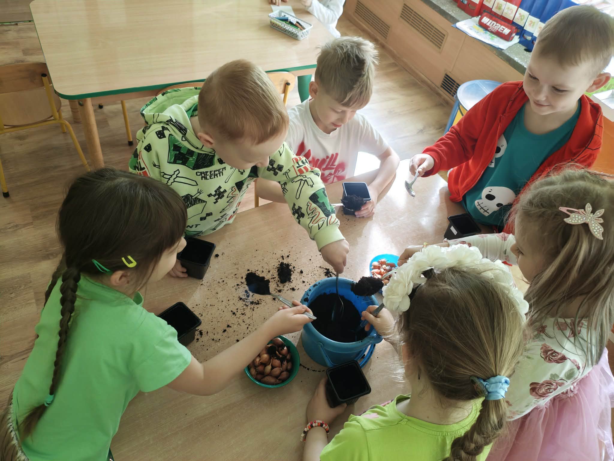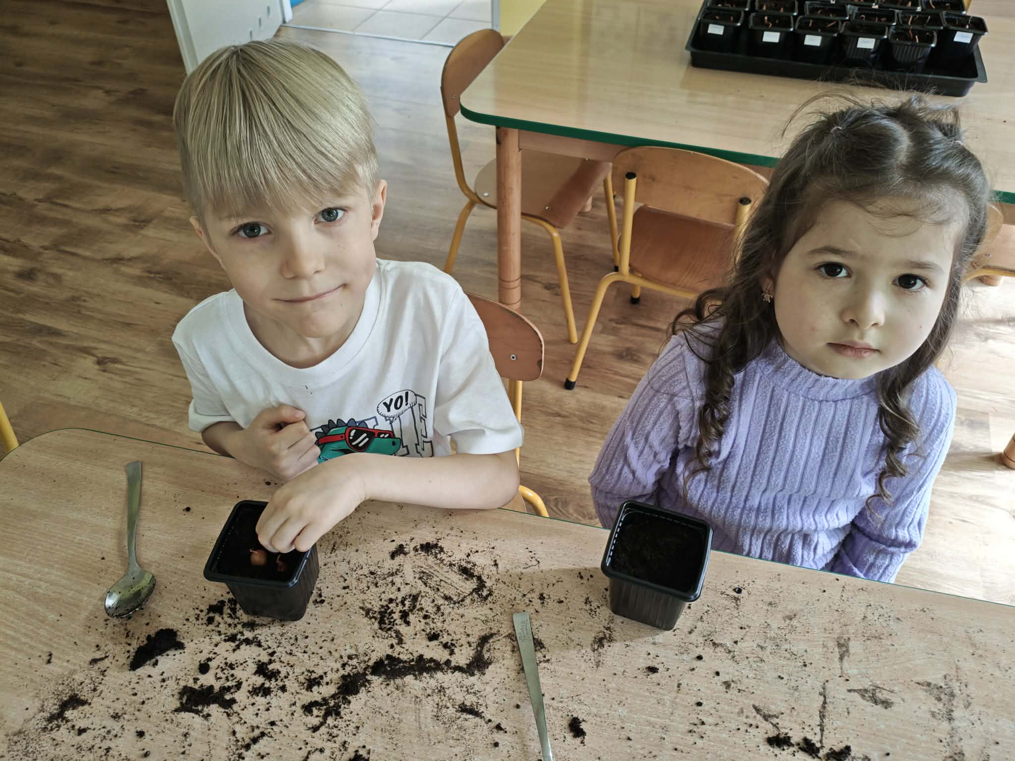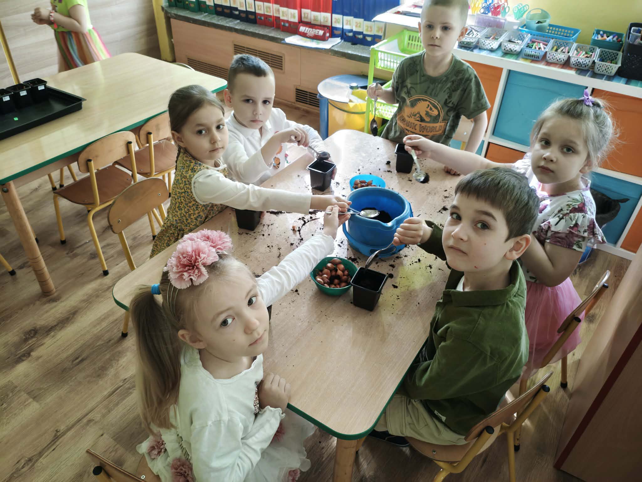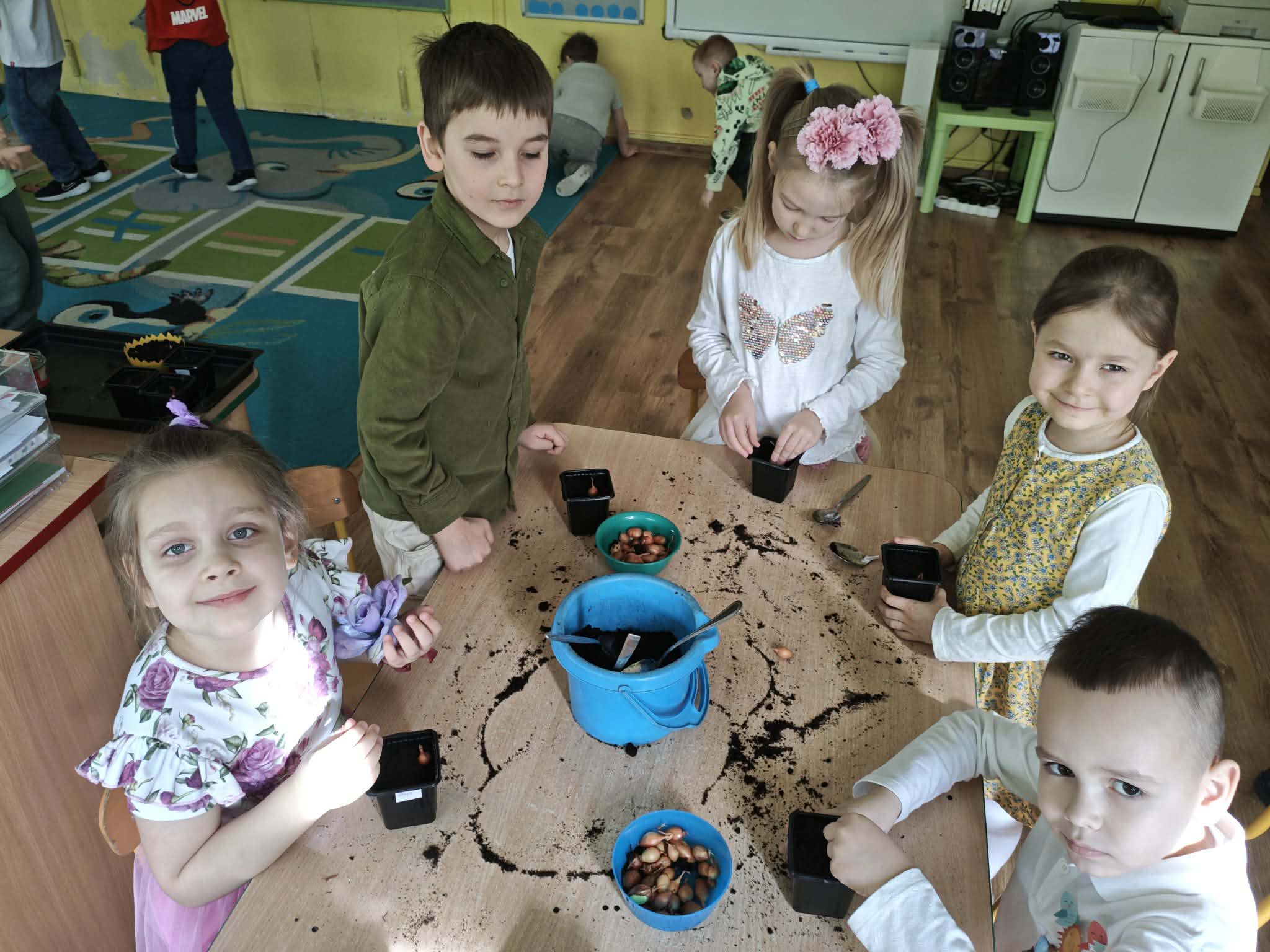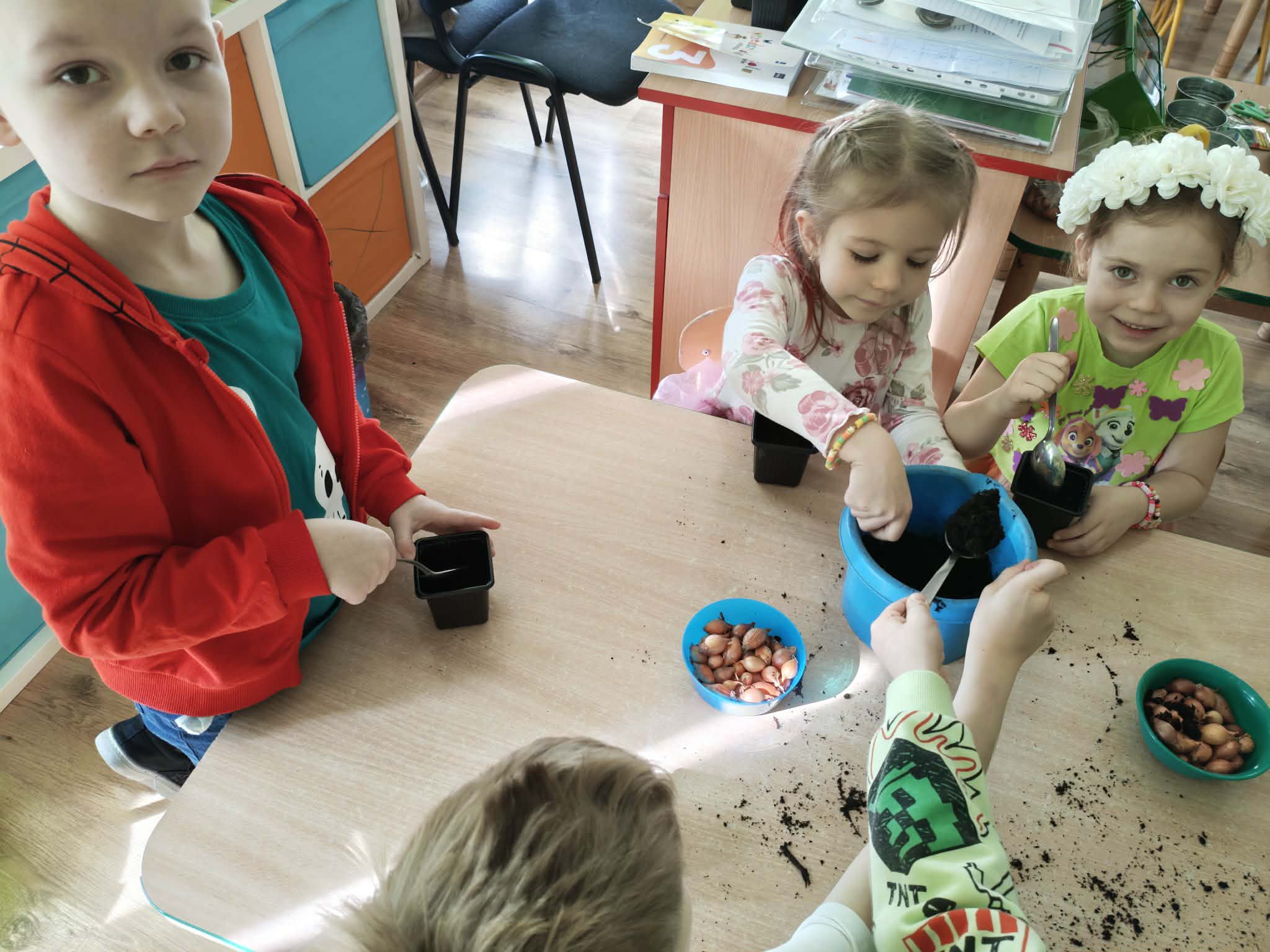 Dzieci z gr III z radością sadziły cebulę, owies ucząc się przy tym o przyrodzie i cyklu życia roślin. Podczas pracy przedszkolaki dowiedziały się, czego rośliny potrzebują do wzrostu- światła, wody i ciepła.