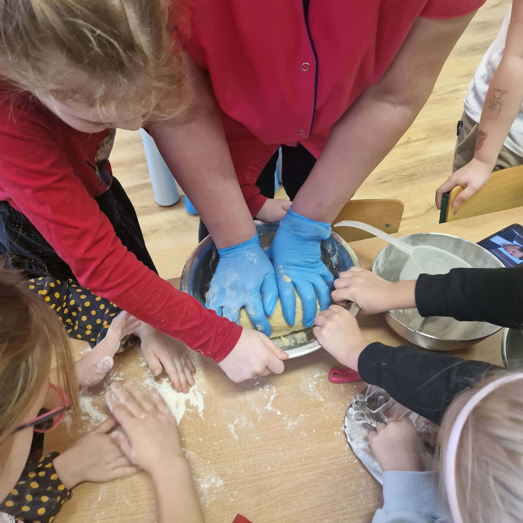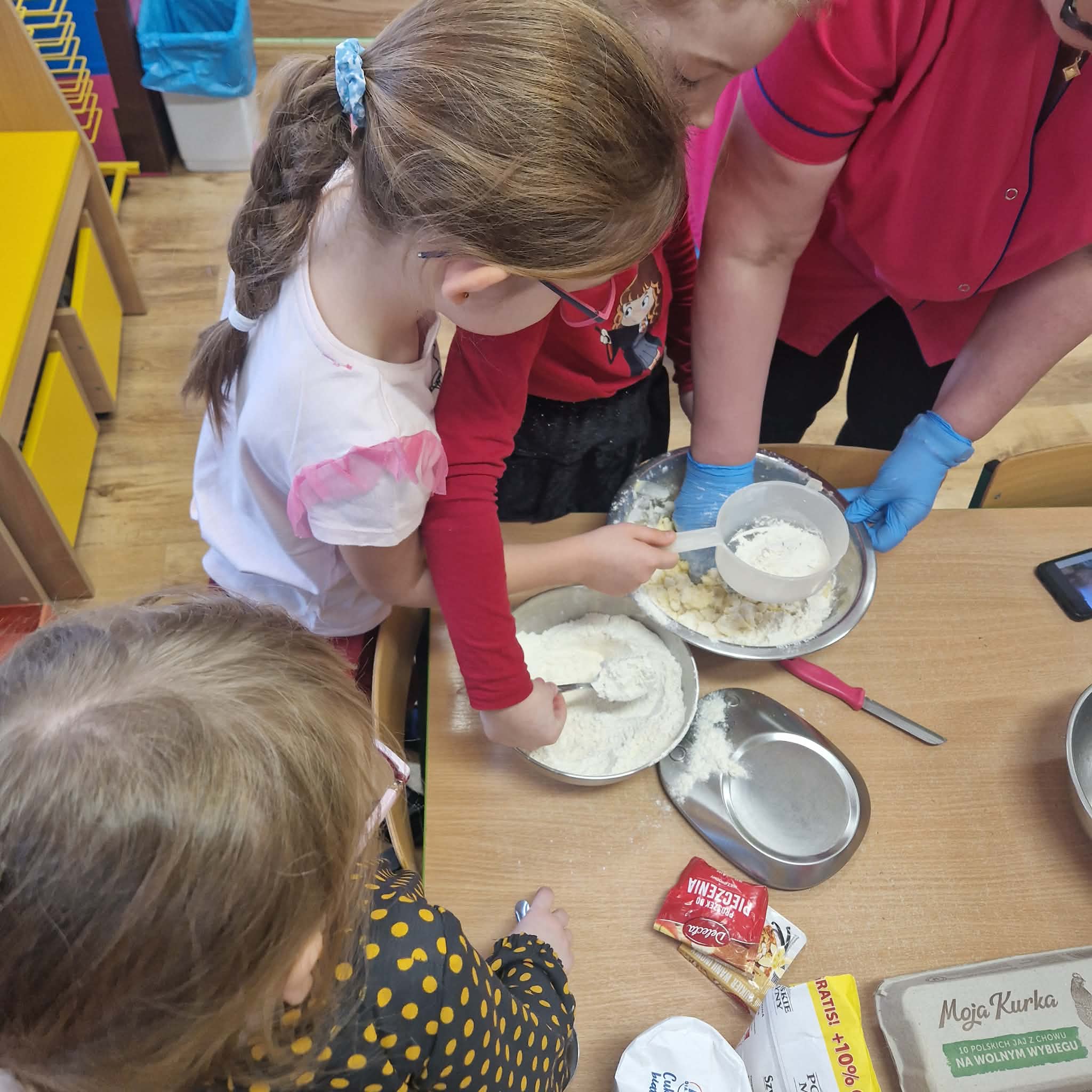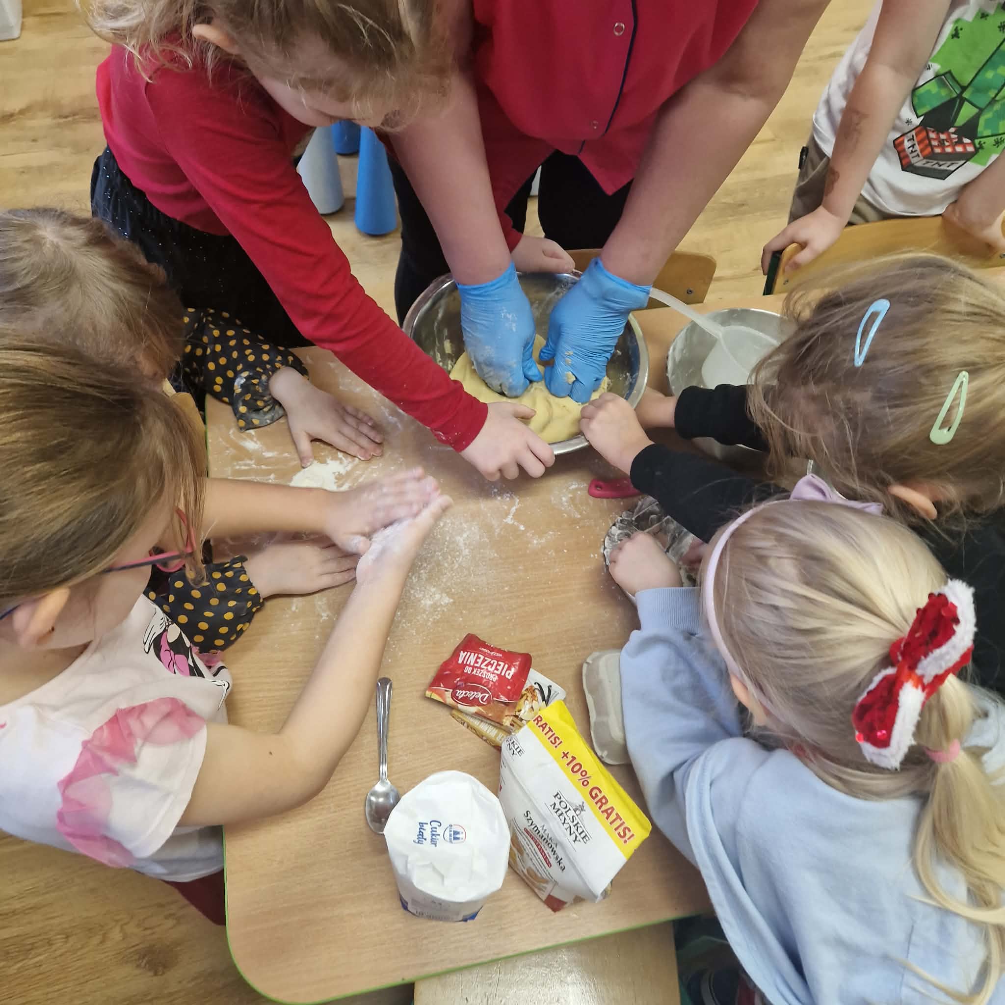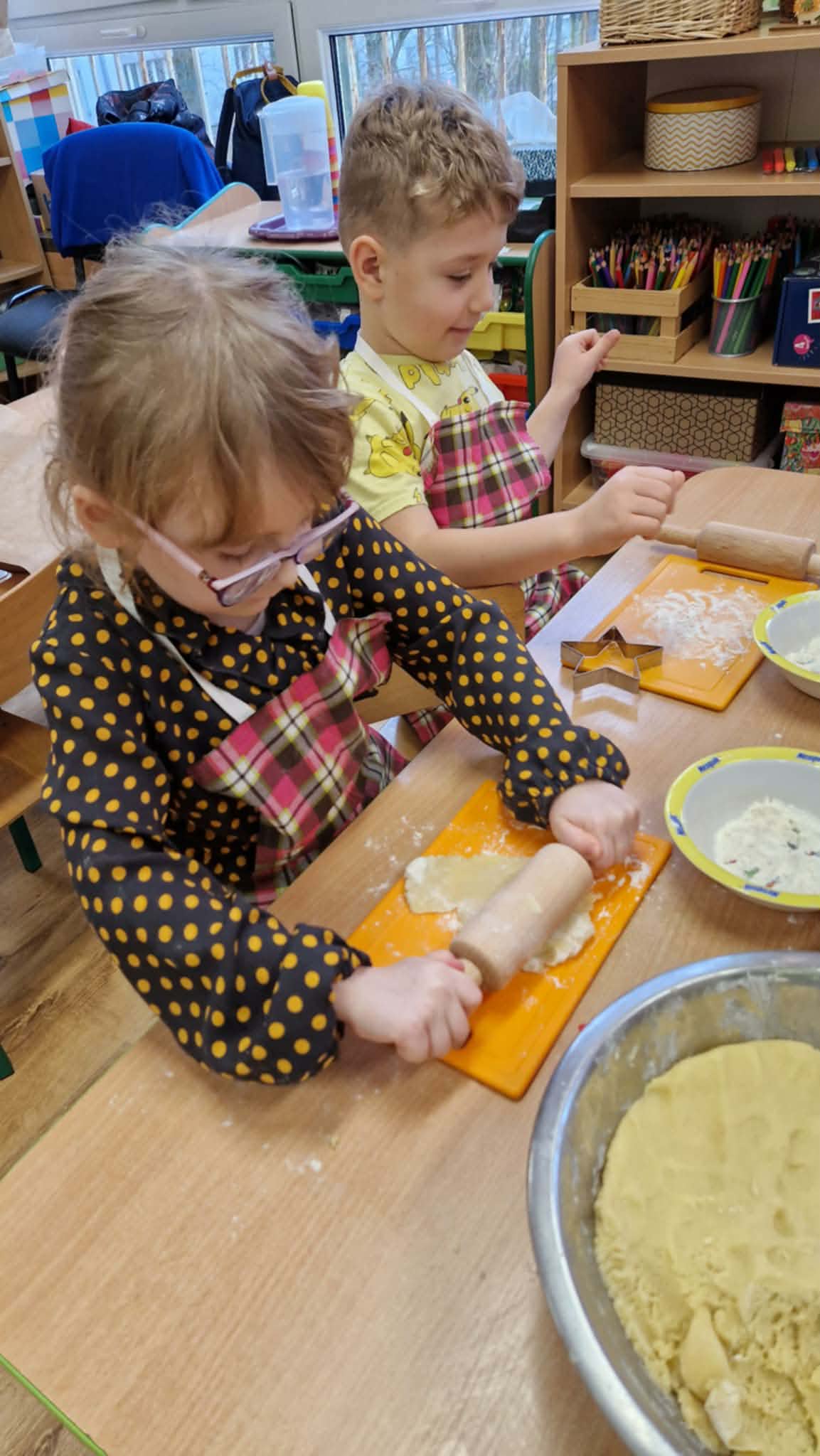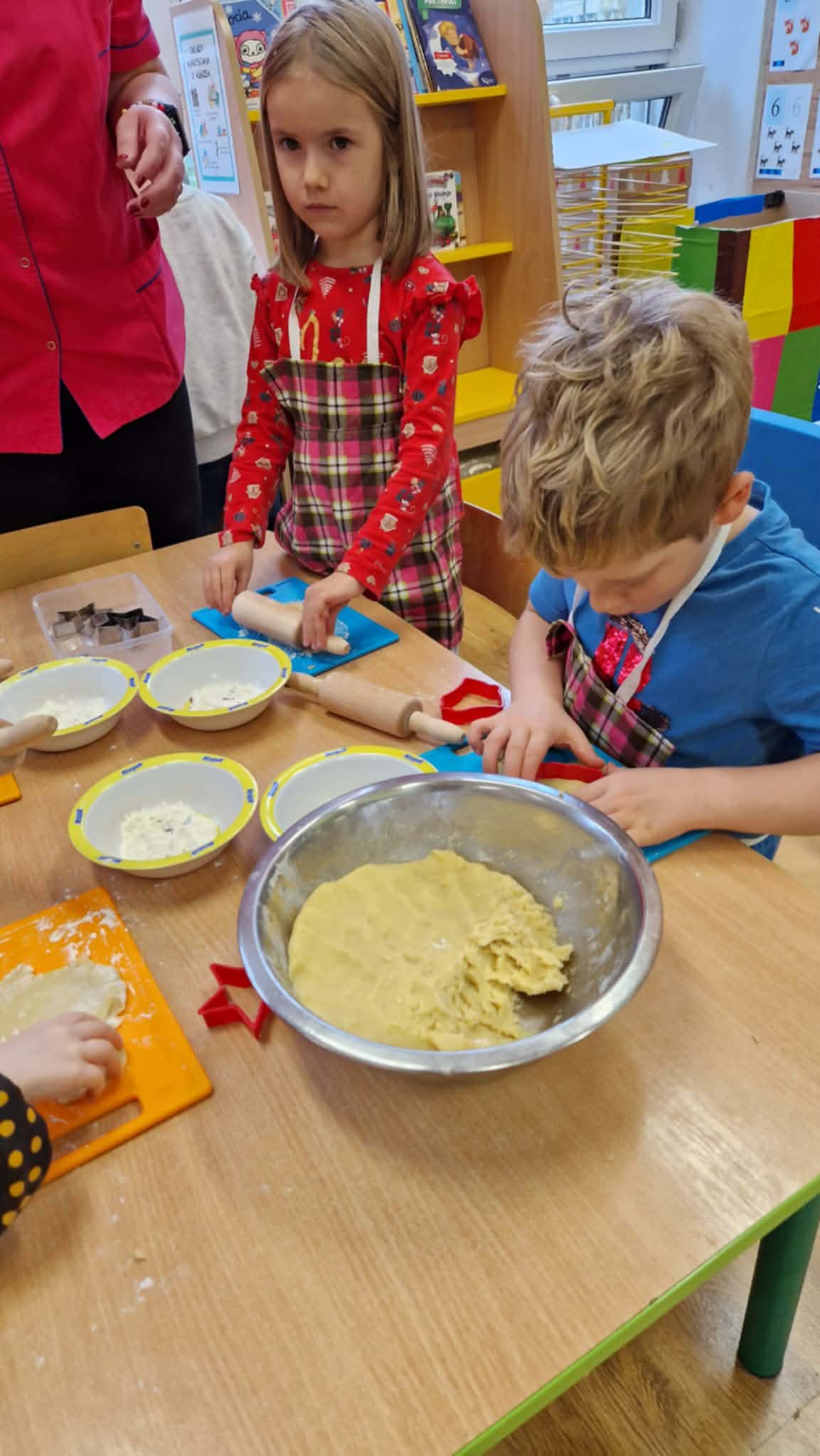 Dziś dzieci z gr 4 przygotowywały kruche ciasteczka maślane na tegoroczny kiermasz bożonarodzeniowy. Dzieci chętnie pomagały przy wyrabianiu ciasta i wykrawaniu świątecznych ciasteczek, cóż to była za frajda. W ten sposób doskonaliły swoje zdolności manualne oraz kulinarne.
