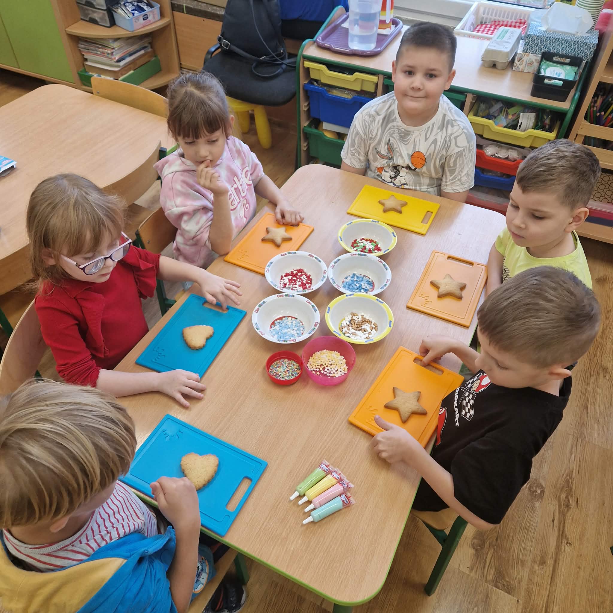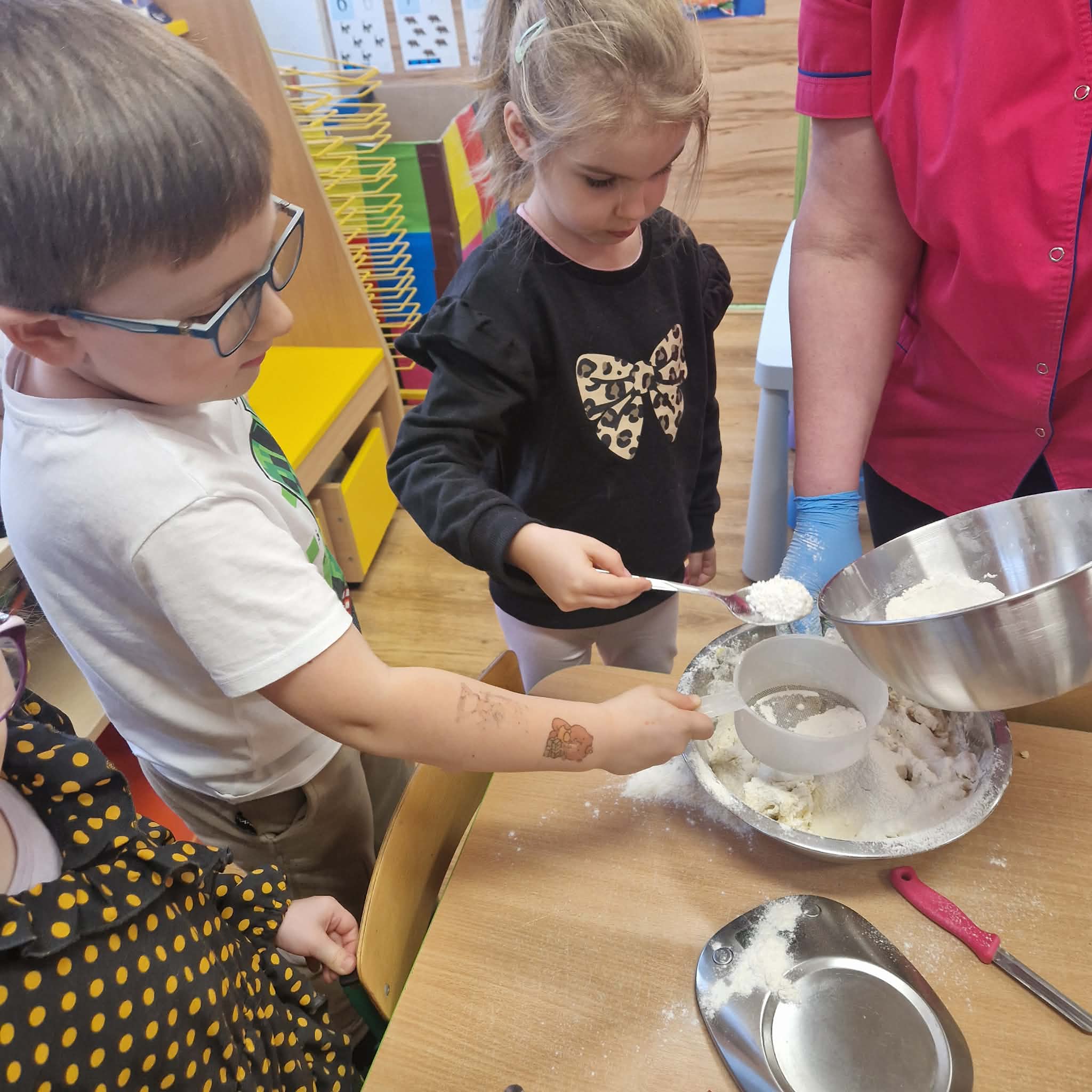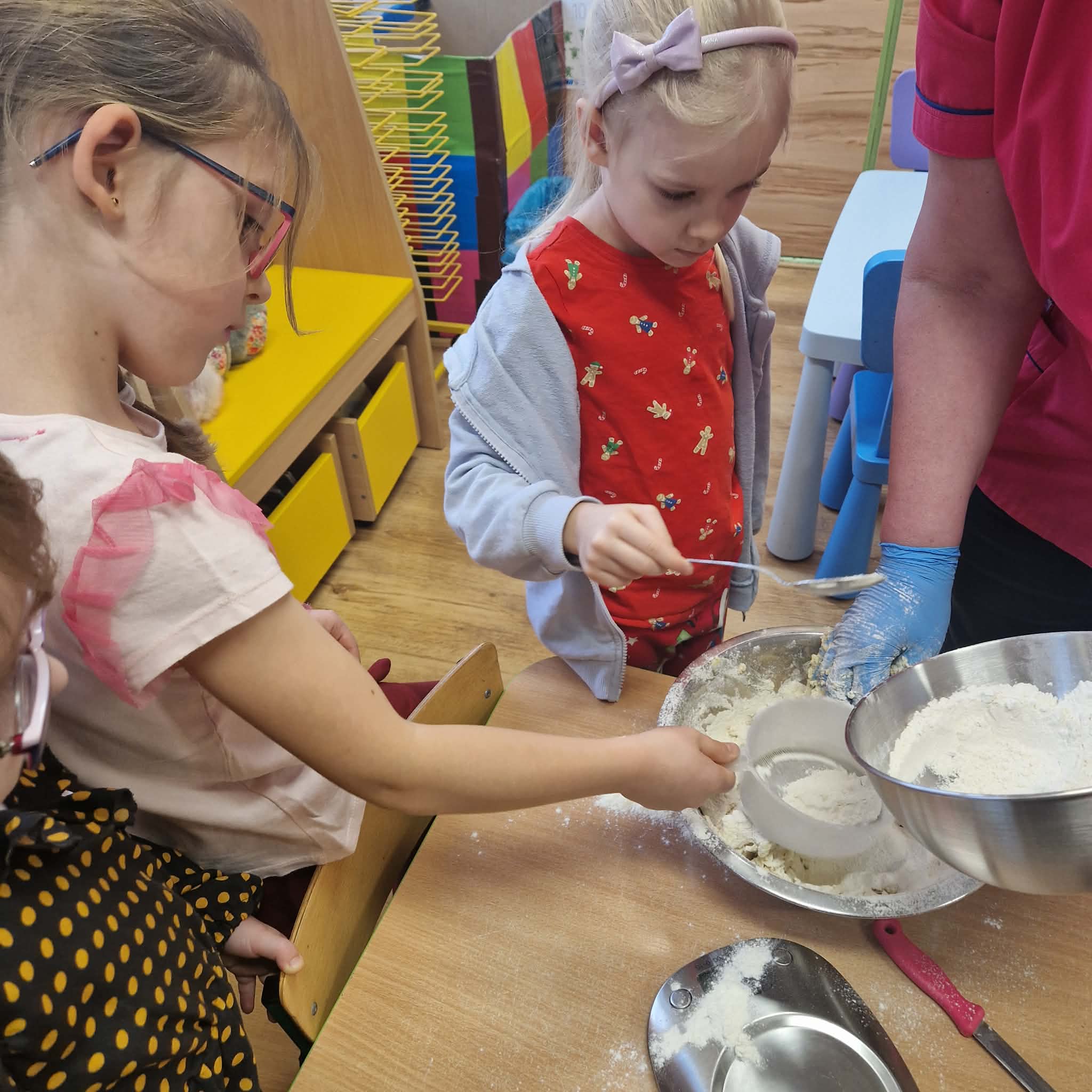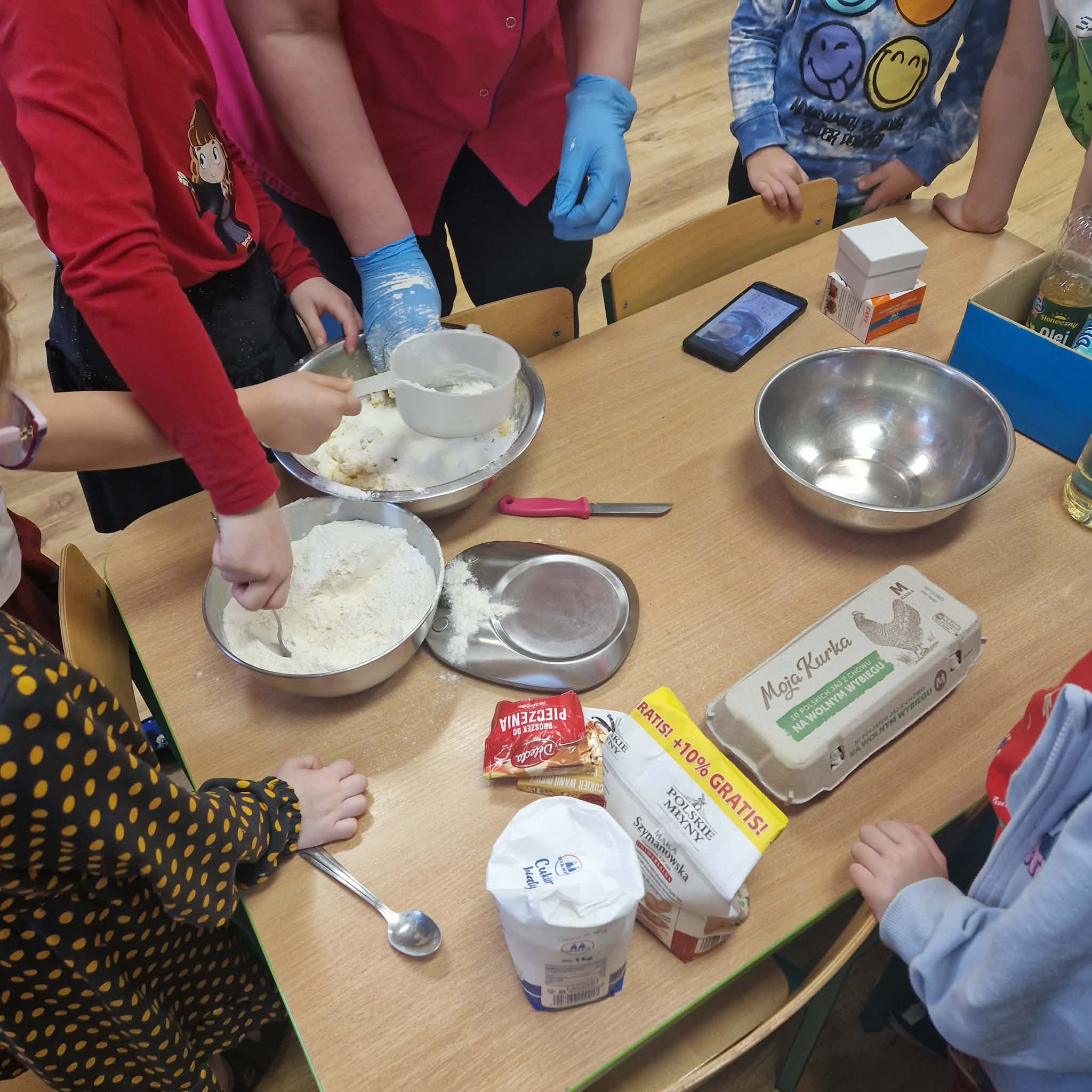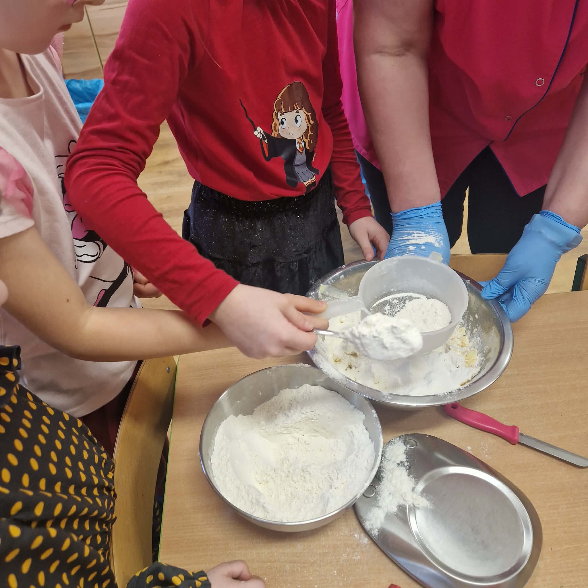 Dziś dzieci z gr 4 przygotowywały kruche ciasteczka maślane na tegoroczny kiermasz bożonarodzeniowy. Dzieci chętnie pomagały przy wyrabianiu ciasta i wykrawaniu świątecznych ciasteczek, cóż to była za frajda. W ten sposób doskonaliły swoje zdolności manualne oraz kulinarne.
