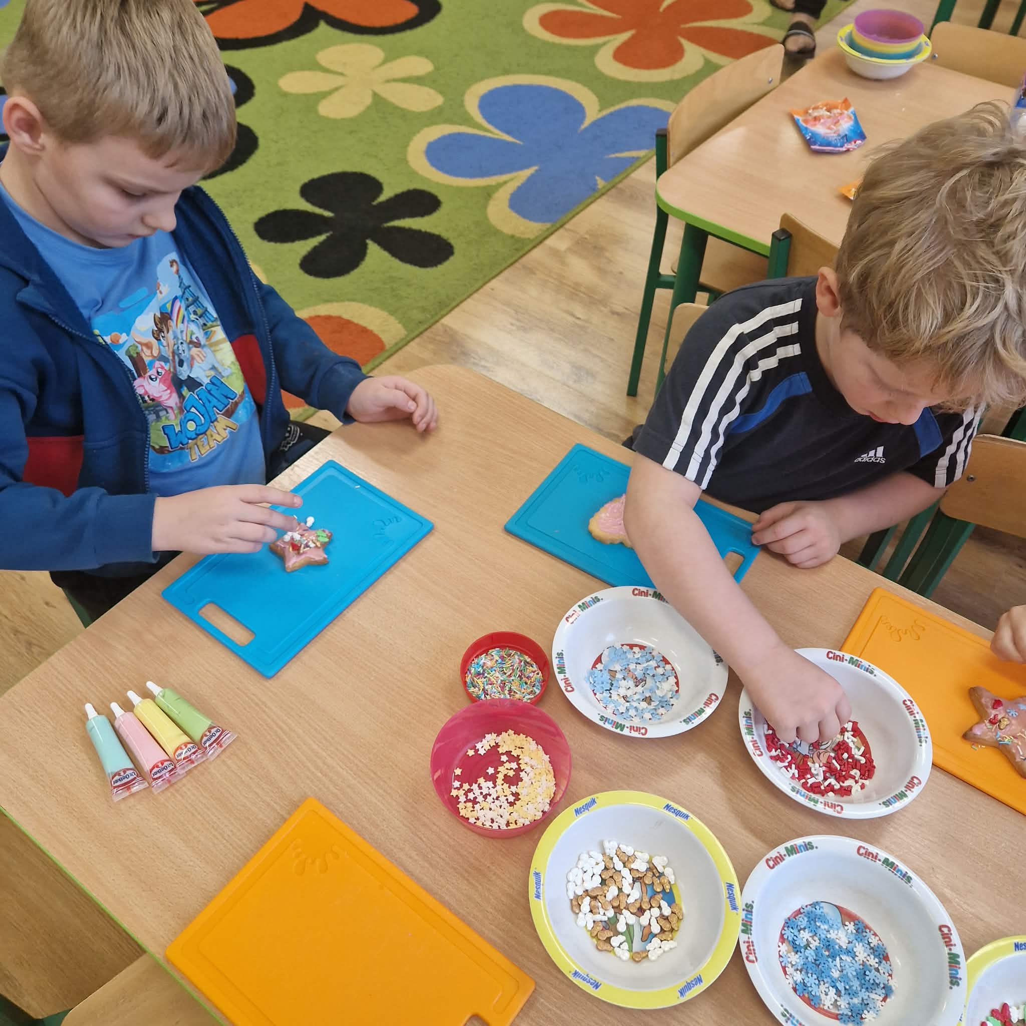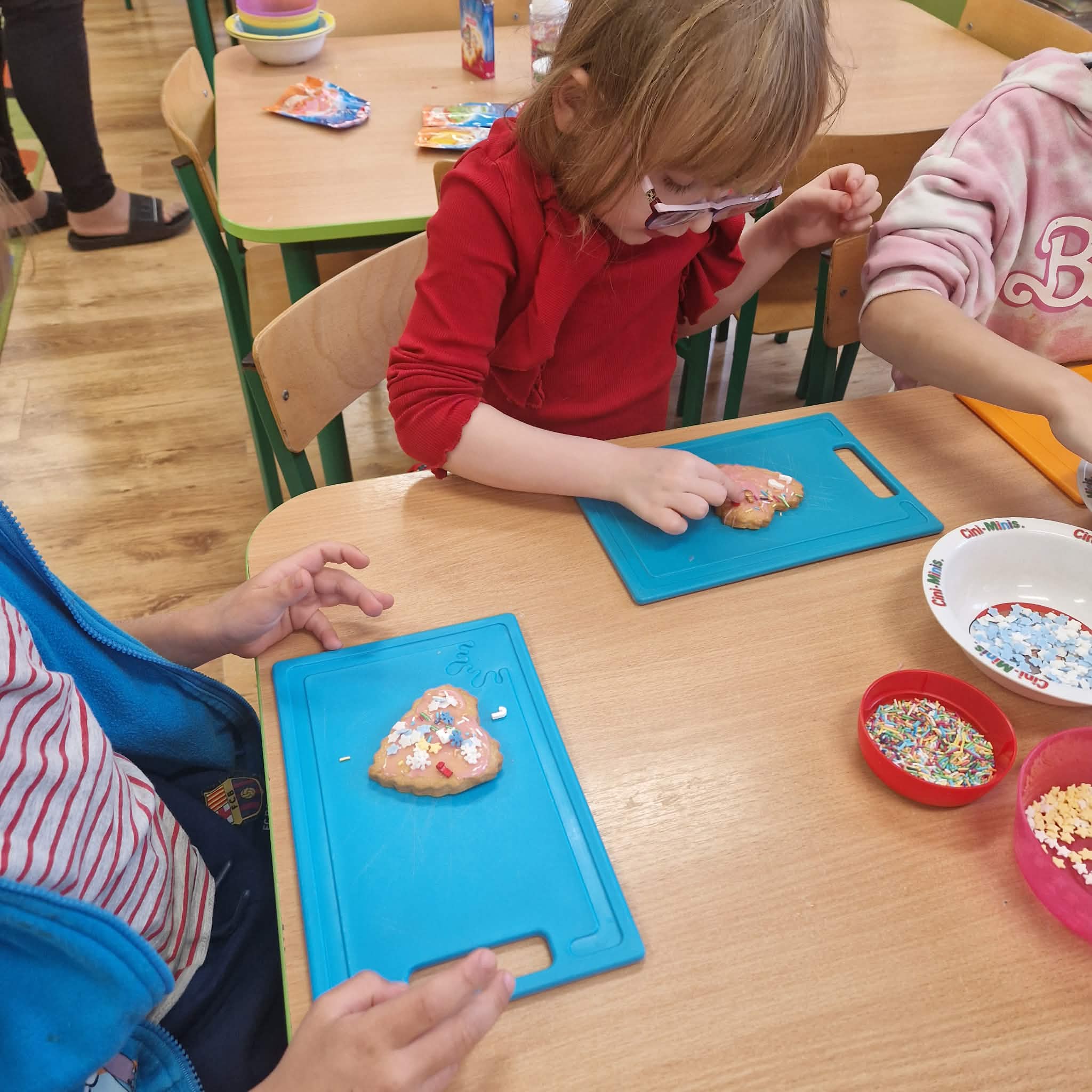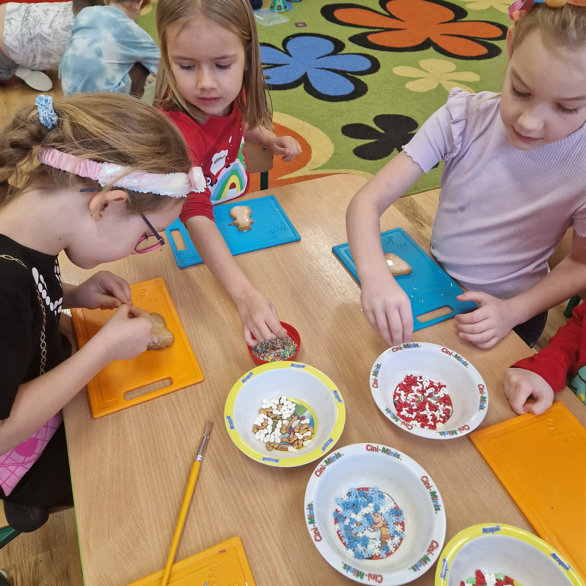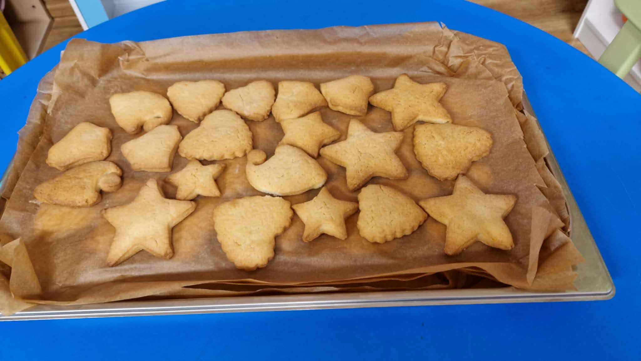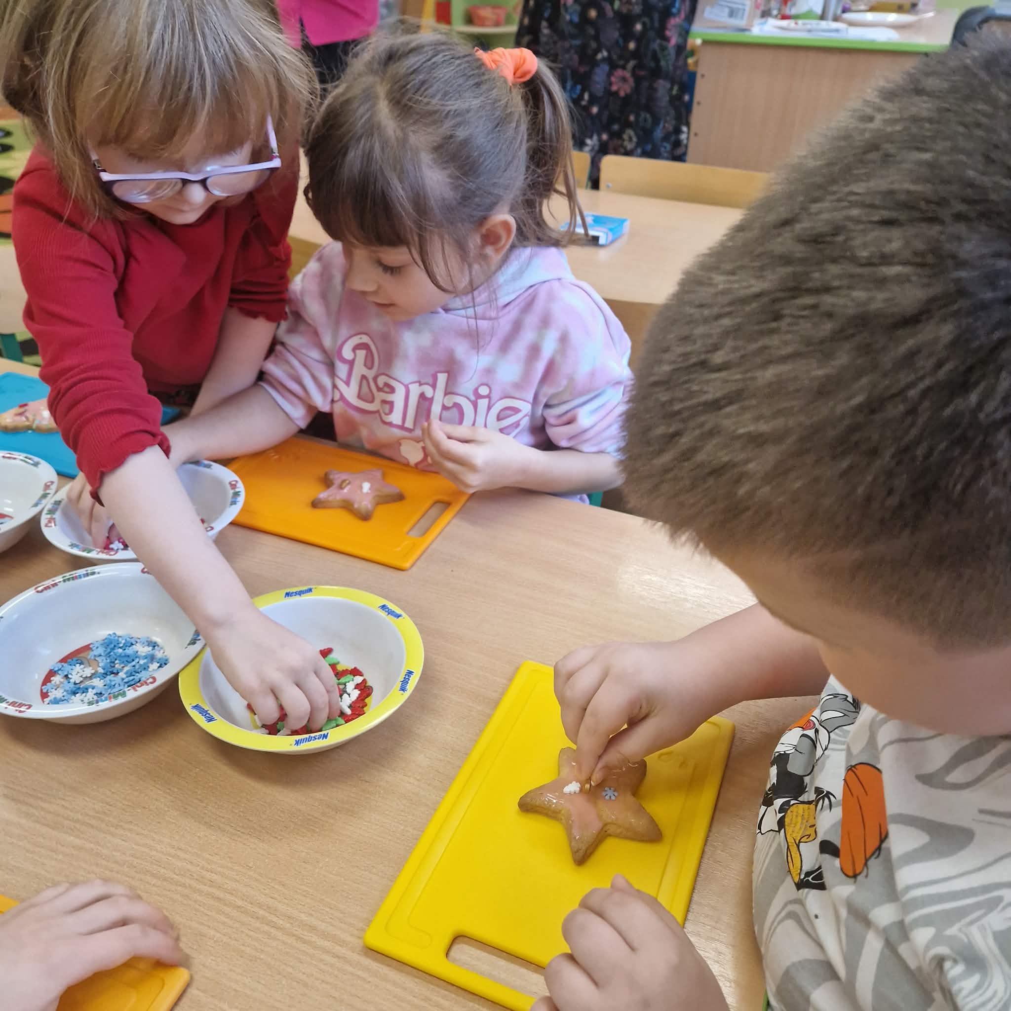 Dziś dzieci z gr 4 przygotowywały kruche ciasteczka maślane na tegoroczny kiermasz bożonarodzeniowy. Dzieci chętnie pomagały przy wyrabianiu ciasta i wykrawaniu świątecznych ciasteczek, cóż to była za frajda. W ten sposób doskonaliły swoje zdolności manualne oraz kulinarne.