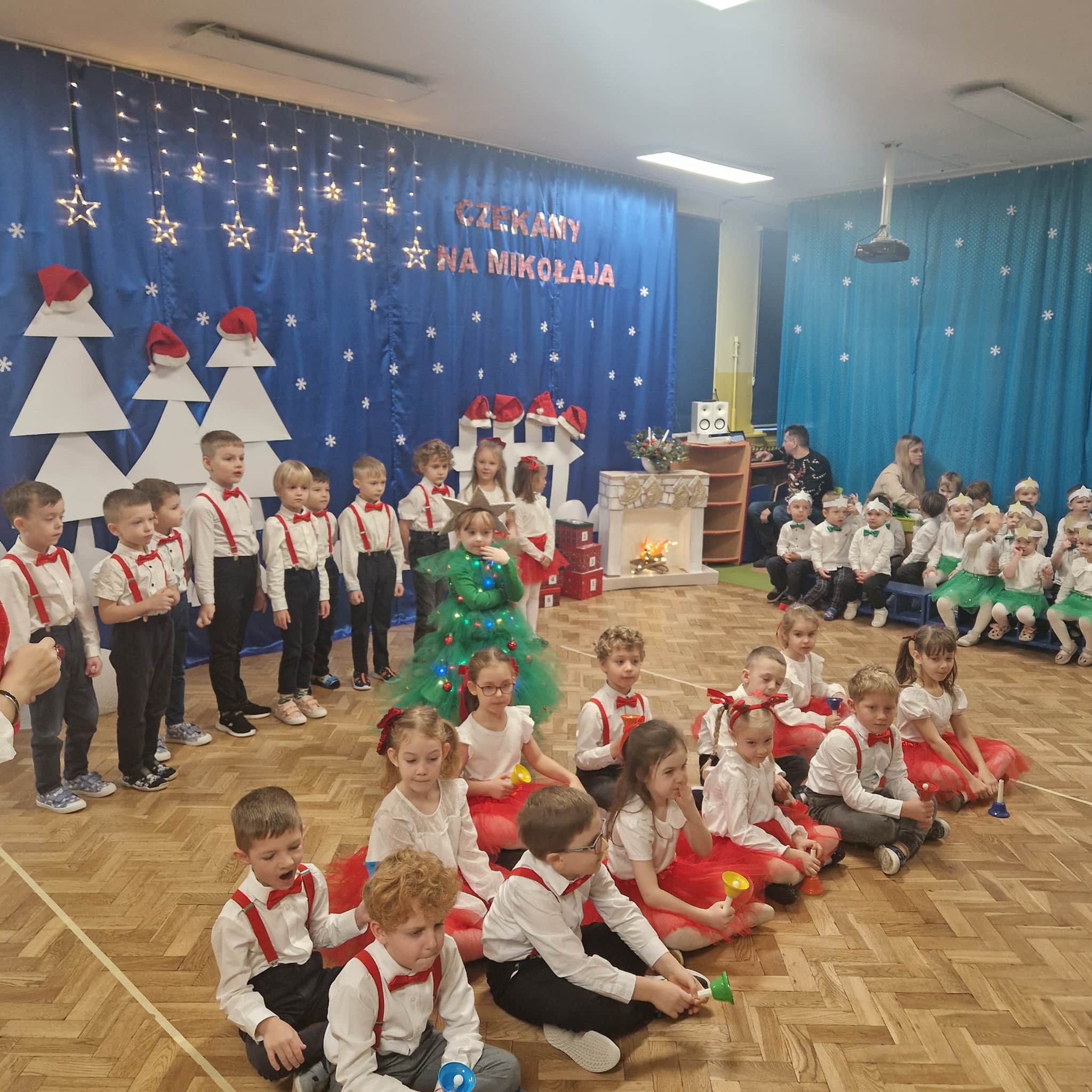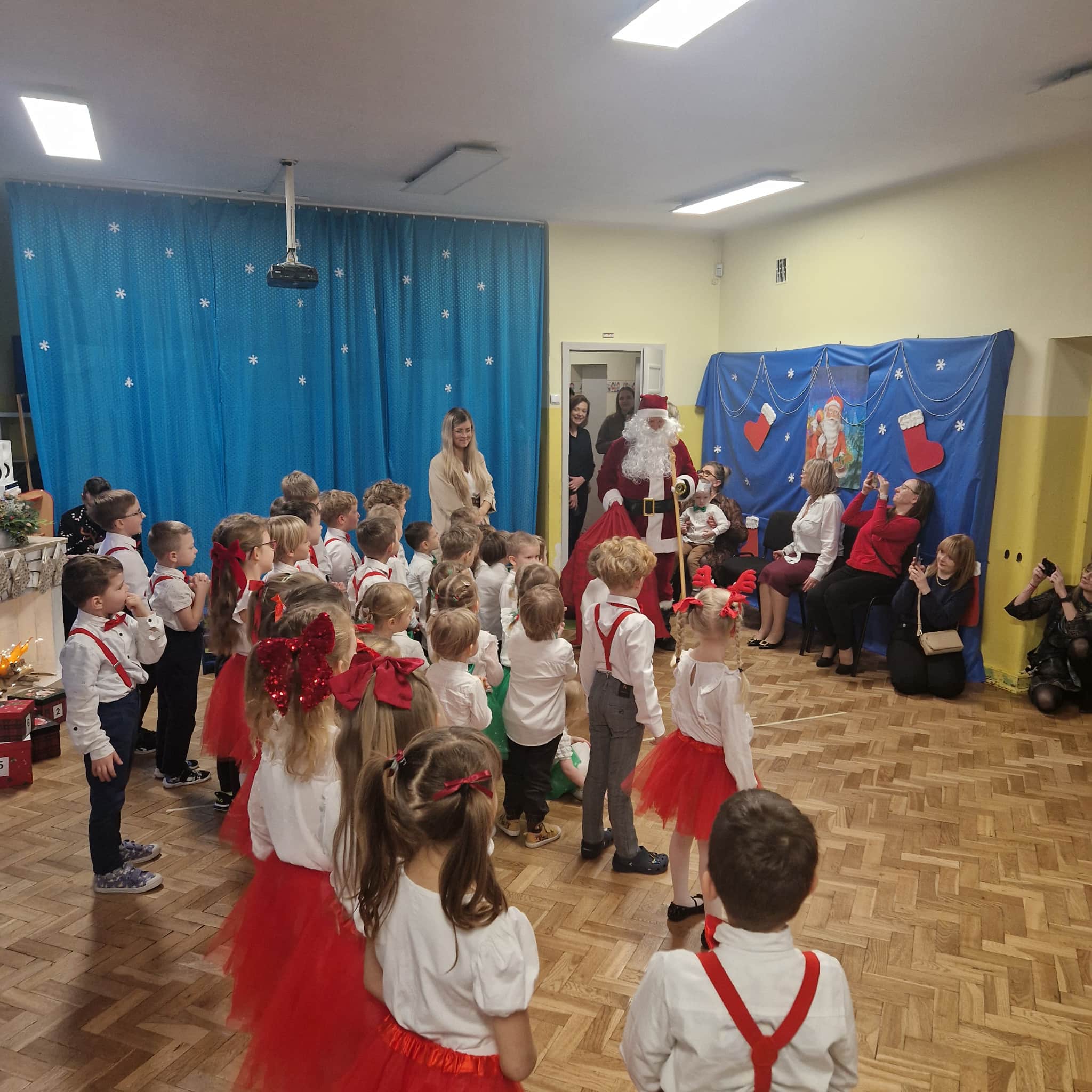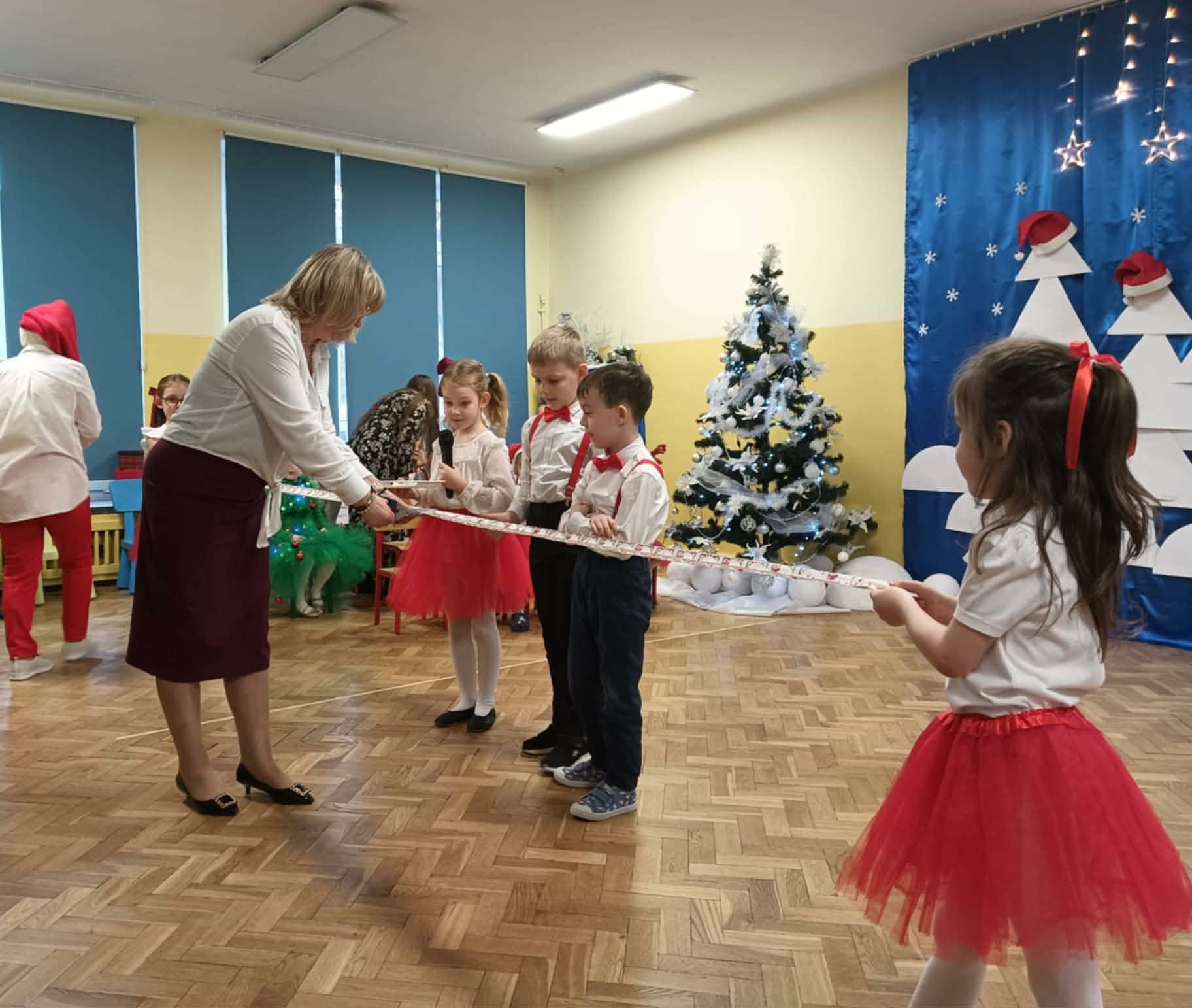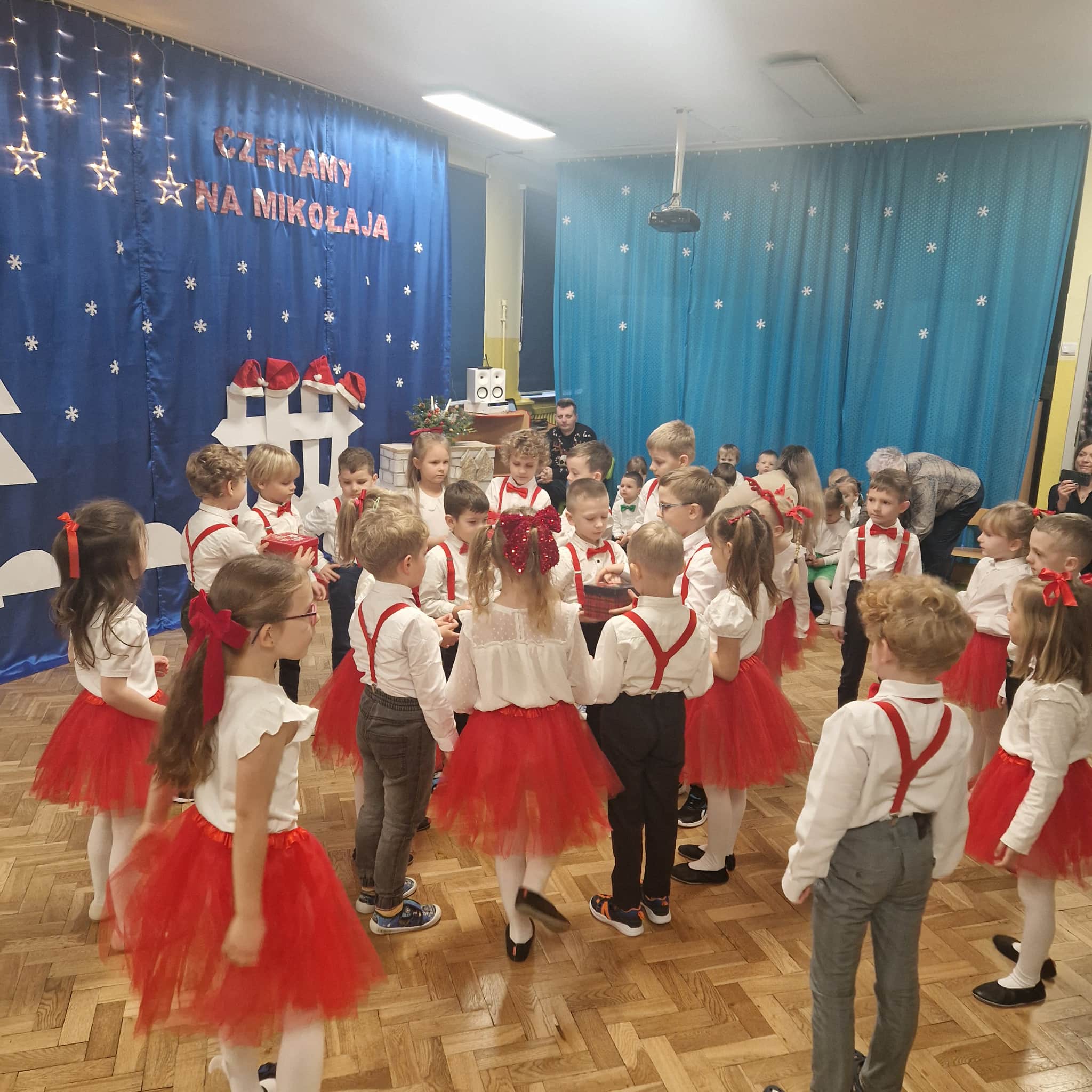 Z okazji zbliżających się Świąt Bożego Narodzenia 05.12.2025r w naszym przedszkolu odbyło się Świąteczne spotkanie z rodzicami. W gwarze przedświątecznych przygotowań, zatrzymaliśmy się na chwilę, aby nie przeoczyć istoty Świat Bożego Narodzenia. Wigilia w gronie przedszkolnej rodziny napełniła serca wszystkich obecnych niezwykłą radością i życzliwością. Bożonarodzeniowy klimat dopełniały świąteczne dekoracje w całym przedszkolu, lampki, świąteczne figurki oraz przystrojona choinka. Wszystkie dzieci zaprezentowały swoim najbliższym program artystyczny, w którym to z wielkim zaangażowaniem recytowały wiersze, tańczyły, śpiewały piosenki, grały na instrumentach muzycznych oraz składały świąteczne życzenia. Ogromną niespodzianką było spotkanie ze Świętym Mikołajem , który obdarował dzieci prezentami. Spotkanie świąteczne upłynęło w miłej i serdecznej atmosferze, z pewnością na długo pozostanie w naszej pamięci.