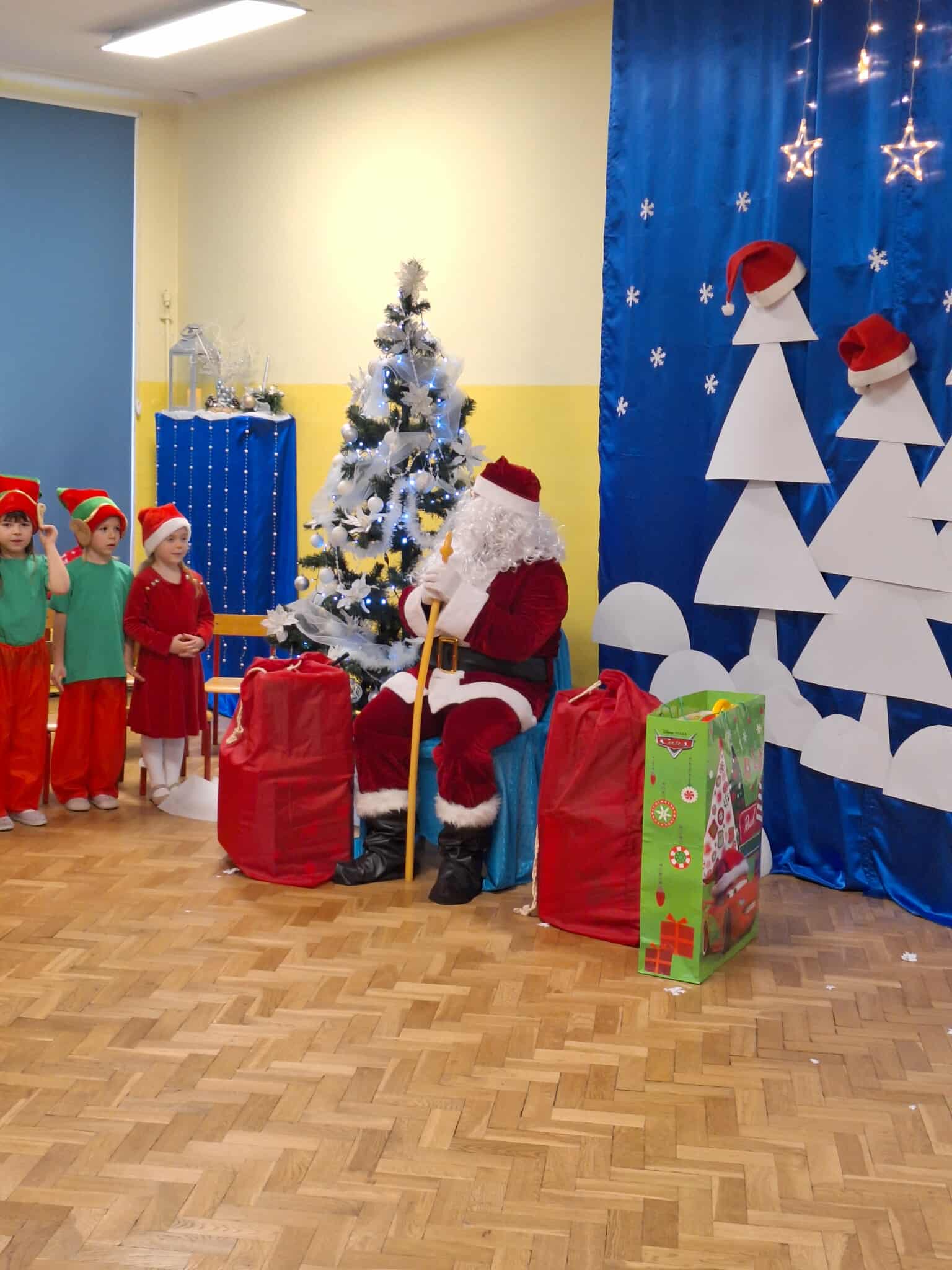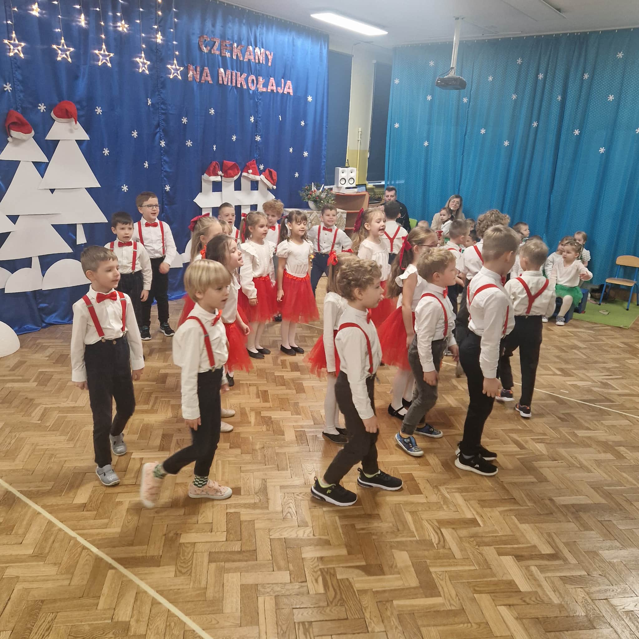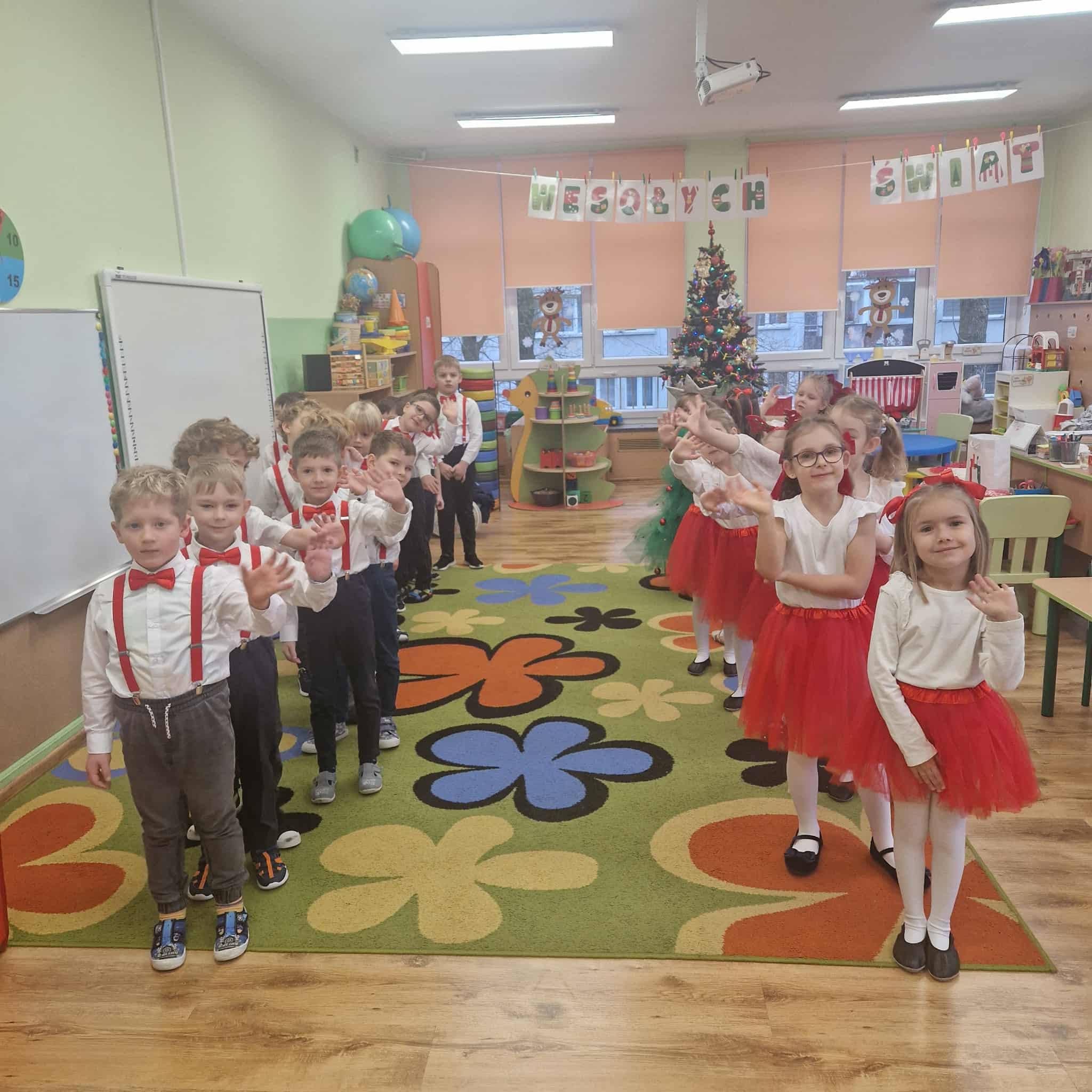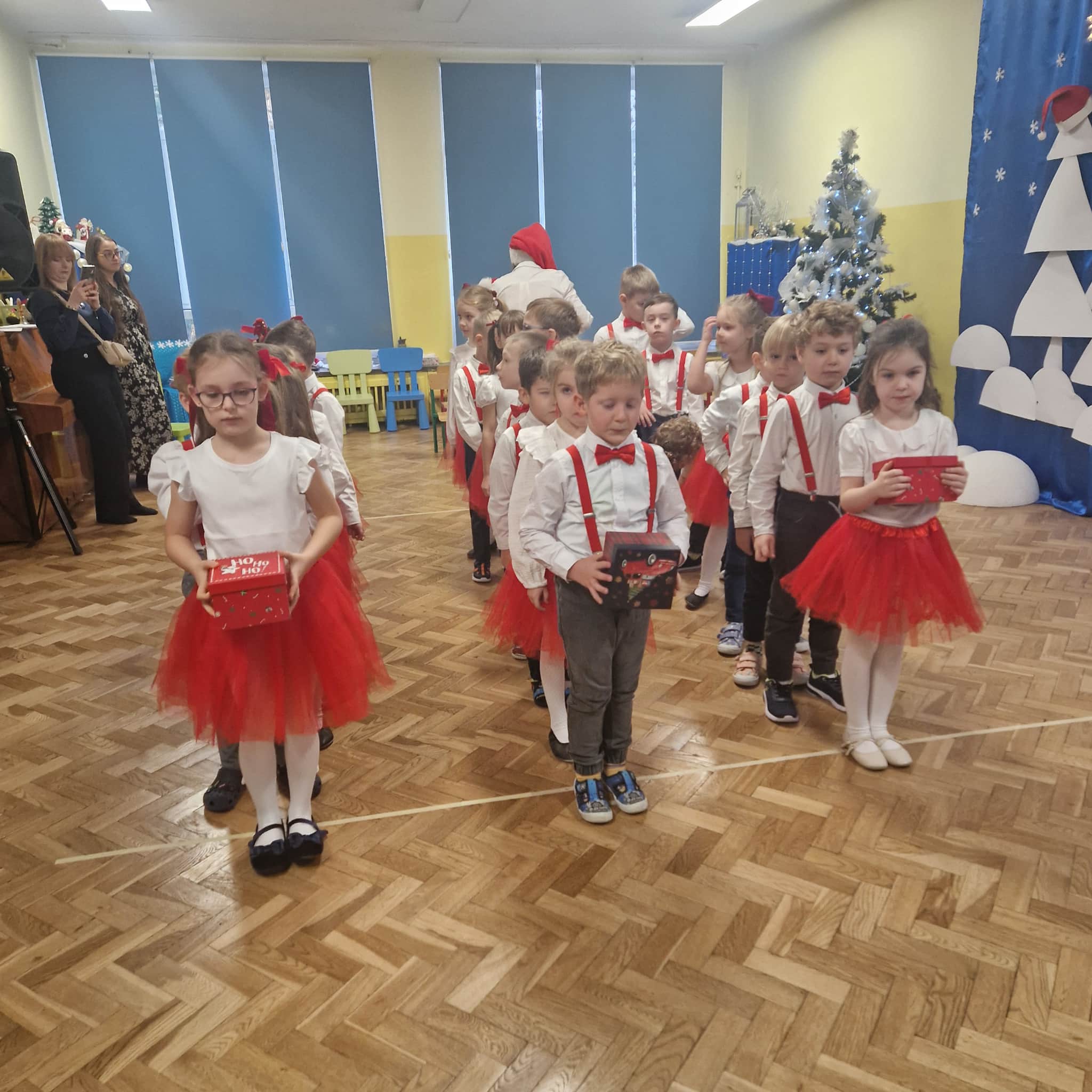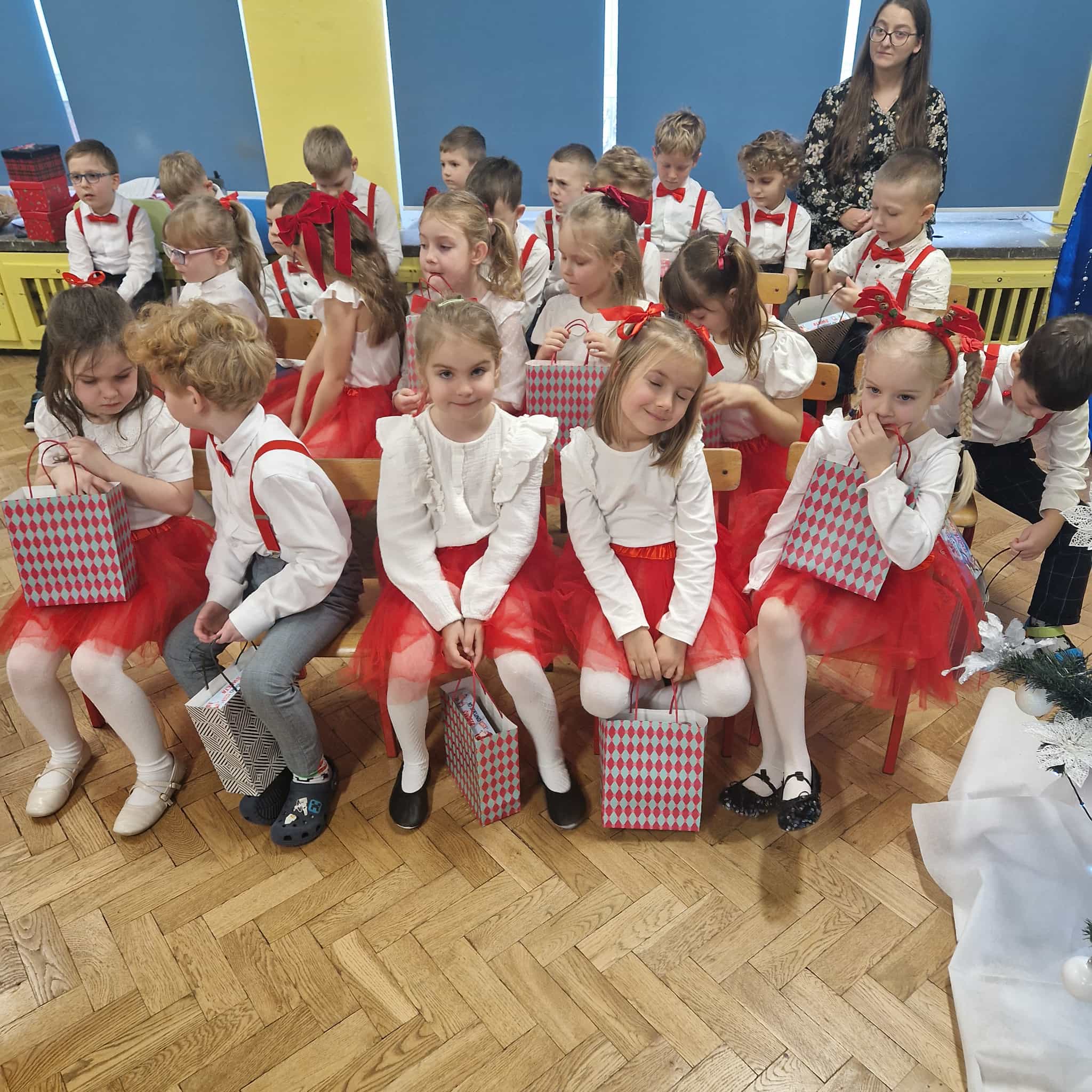 Z okazji zbliżających się Świąt Bożego Narodzenia 05.12.2025r w naszym przedszkolu odbyło się Świąteczne spotkanie z rodzicami. W gwarze przedświątecznych przygotowań, zatrzymaliśmy się na chwilę, aby nie przeoczyć istoty Świat Bożego Narodzenia. Wigilia w gronie przedszkolnej rodziny napełniła serca wszystkich obecnych niezwykłą radością i życzliwością. Bożonarodzeniowy klimat dopełniały świąteczne dekoracje w całym przedszkolu, lampki, świąteczne figurki oraz przystrojona choinka. Wszystkie dzieci zaprezentowały swoim najbliższym program artystyczny, w którym to z wielkim zaangażowaniem recytowały wiersze, tańczyły, śpiewały piosenki, grały na instrumentach muzycznych oraz składały świąteczne życzenia. Ogromną niespodzianką było spotkanie ze Świętym Mikołajem , który obdarował dzieci prezentami. Spotkanie świąteczne upłynęło w miłej i serdecznej atmosferze, z pewnością na długo pozostanie w naszej pamięci.