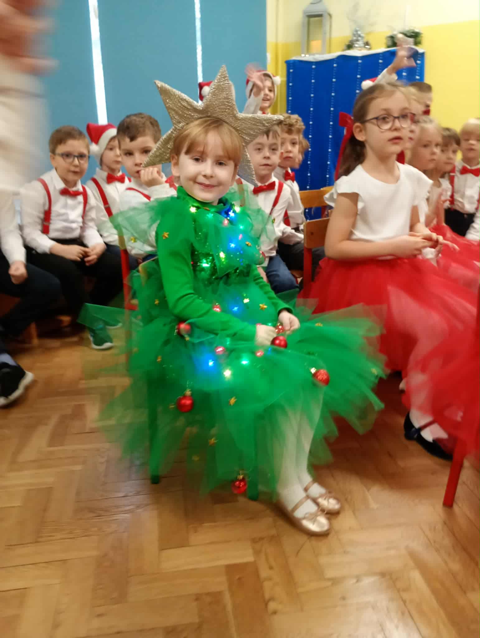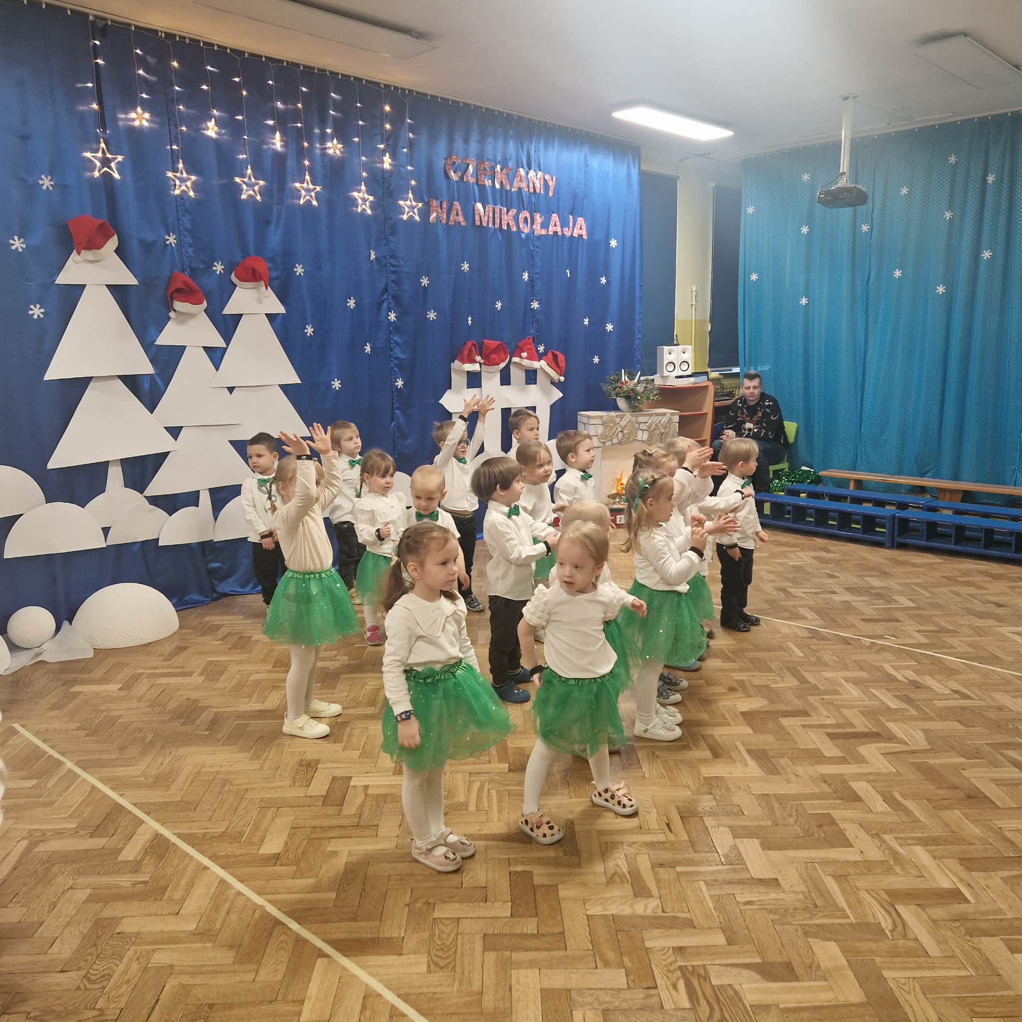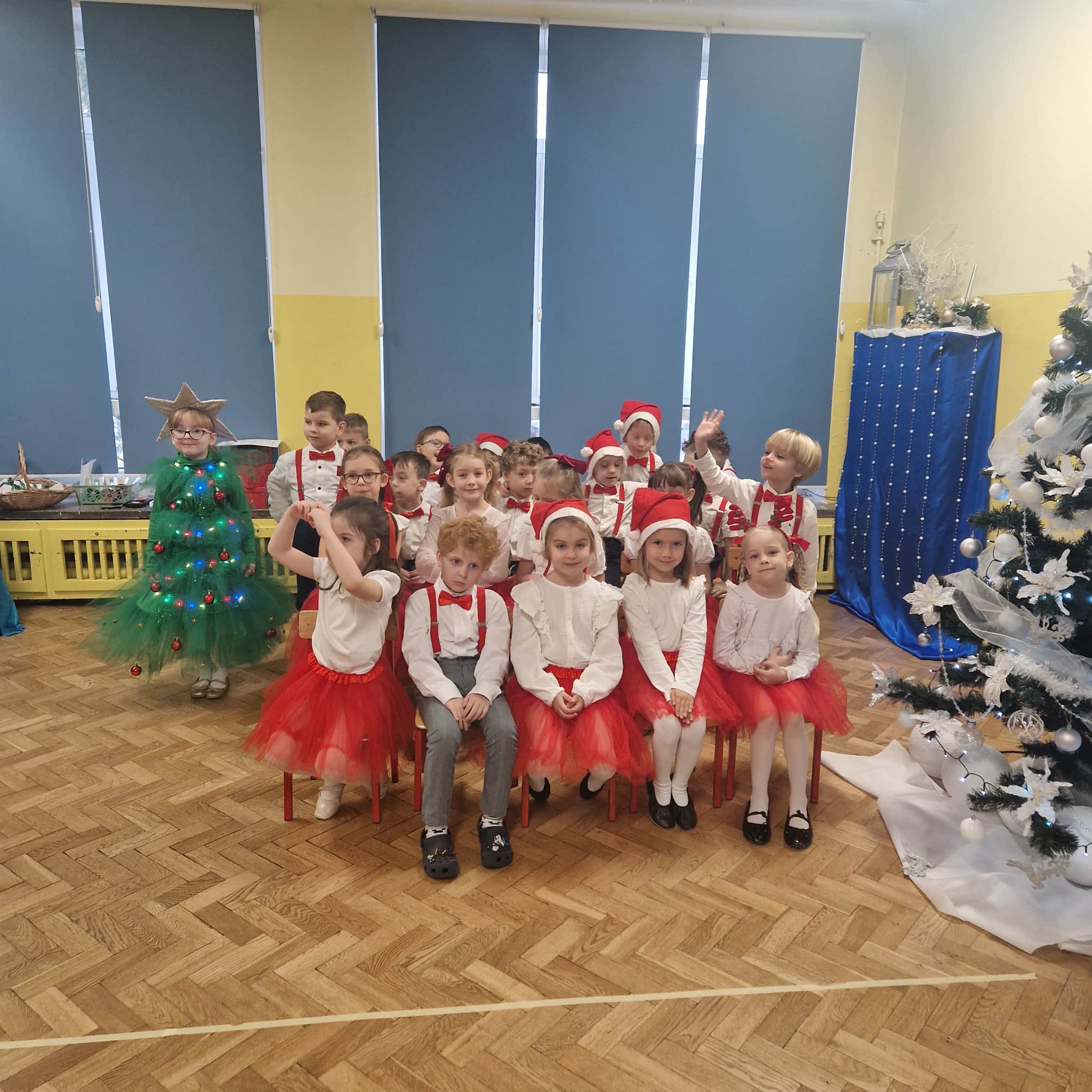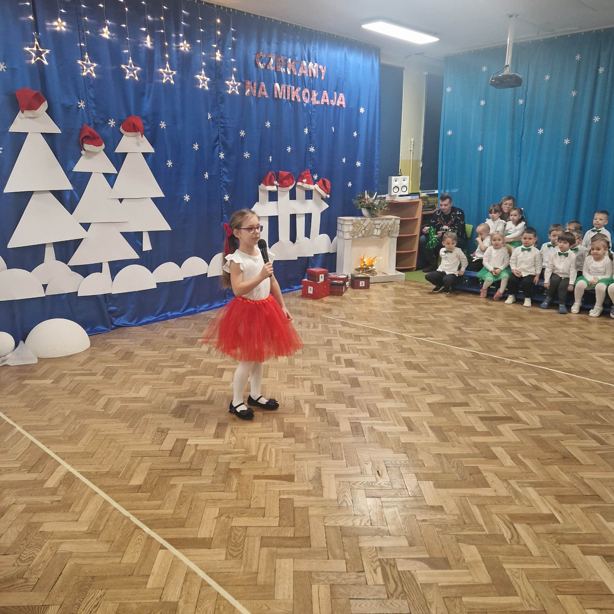 Z okazji zbliżających się Świąt Bożego Narodzenia 05.12.2025r w naszym przedszkolu odbyło się Świąteczne spotkanie z rodzicami. W gwarze przedświątecznych przygotowań, zatrzymaliśmy się na chwilę, aby nie przeoczyć istoty Świat Bożego Narodzenia. Wigilia w gronie przedszkolnej rodziny napełniła serca wszystkich obecnych niezwykłą radością i życzliwością. Bożonarodzeniowy klimat dopełniały świąteczne dekoracje w całym przedszkolu, lampki, świąteczne figurki oraz przystrojona choinka. Wszystkie dzieci zaprezentowały swoim najbliższym program artystyczny, w którym to z wielkim zaangażowaniem recytowały wiersze, tańczyły, śpiewały piosenki, grały na instrumentach muzycznych oraz składały świąteczne życzenia. Ogromną niespodzianką było spotkanie ze Świętym Mikołajem , który obdarował dzieci prezentami. Spotkanie świąteczne upłynęło w miłej i serdecznej atmosferze, z pewnością na długo pozostanie w naszej pamięci.
