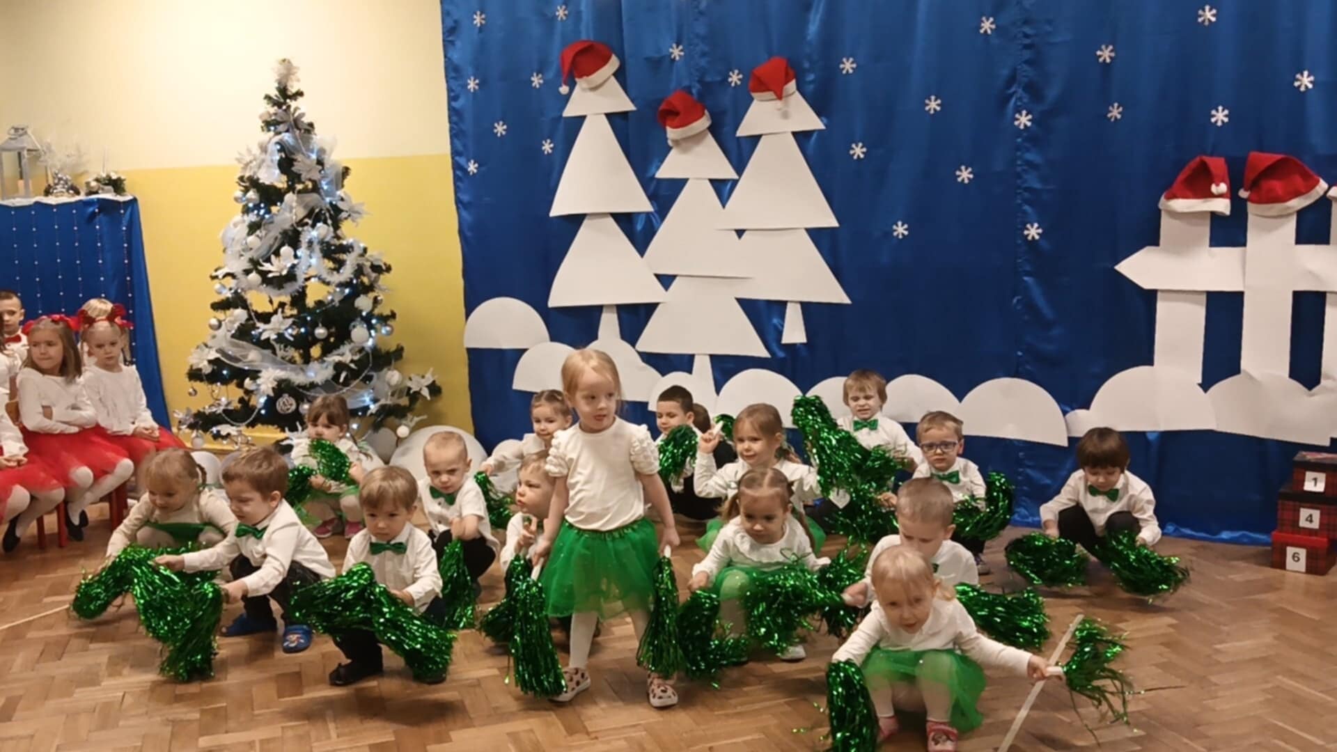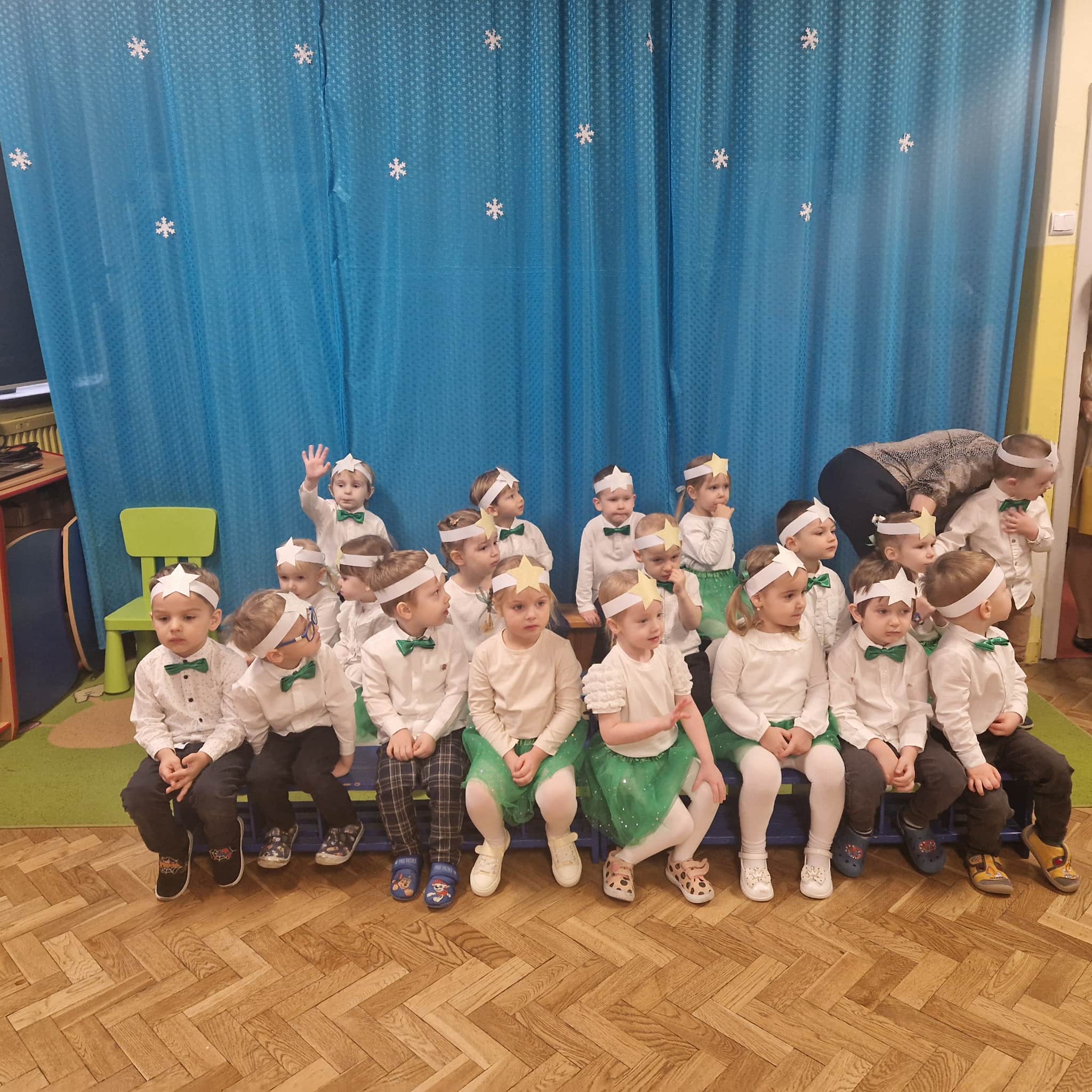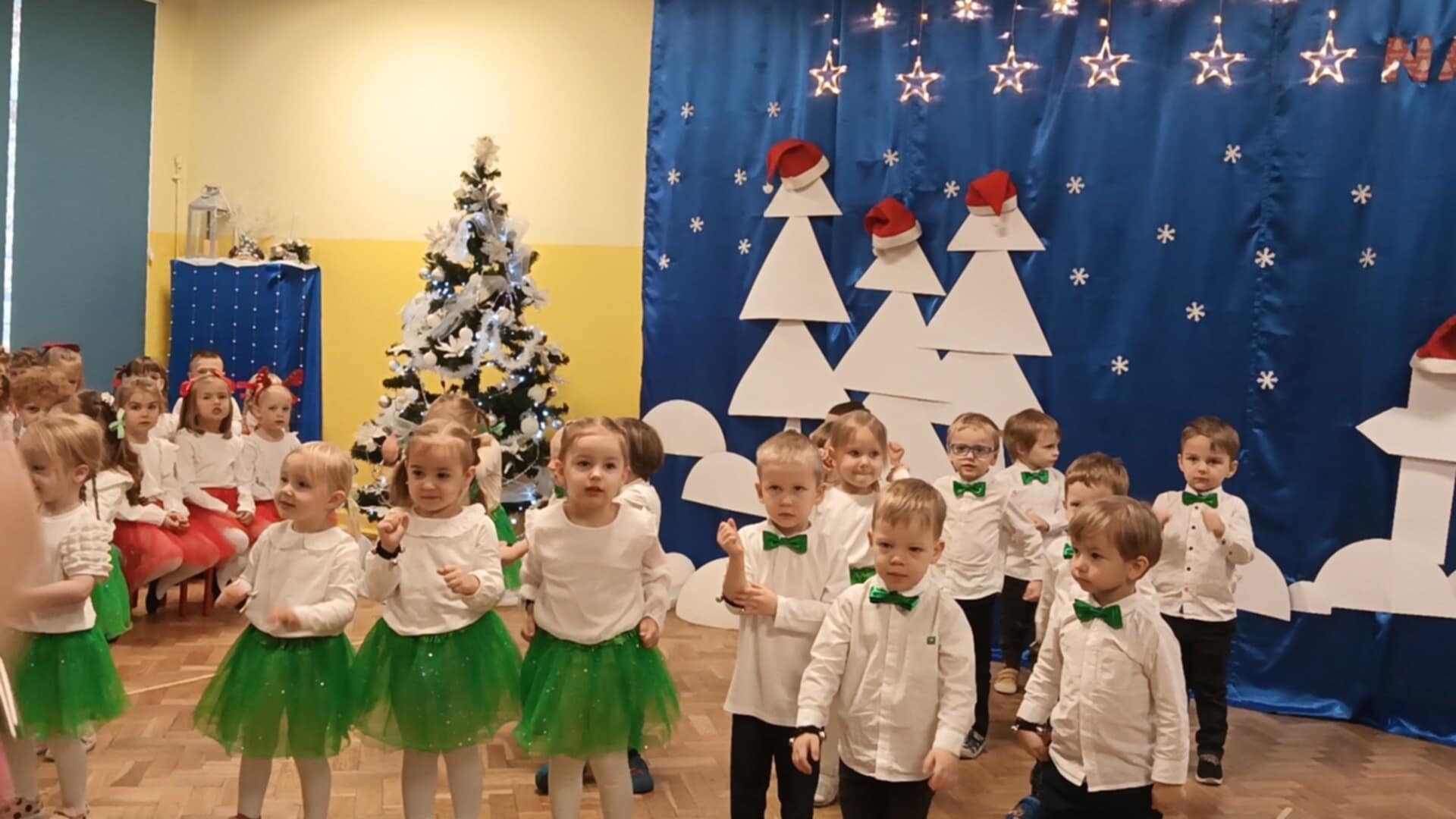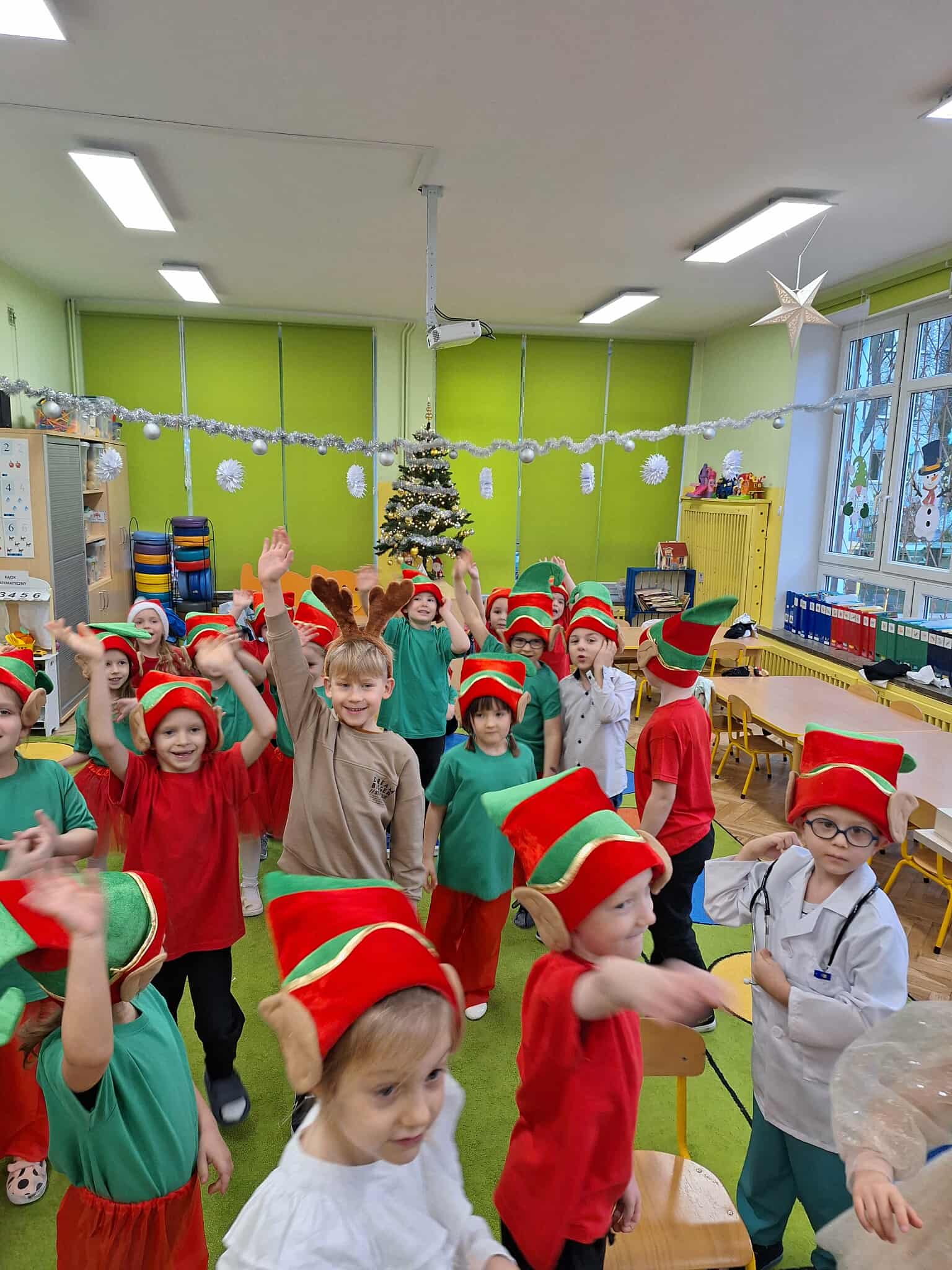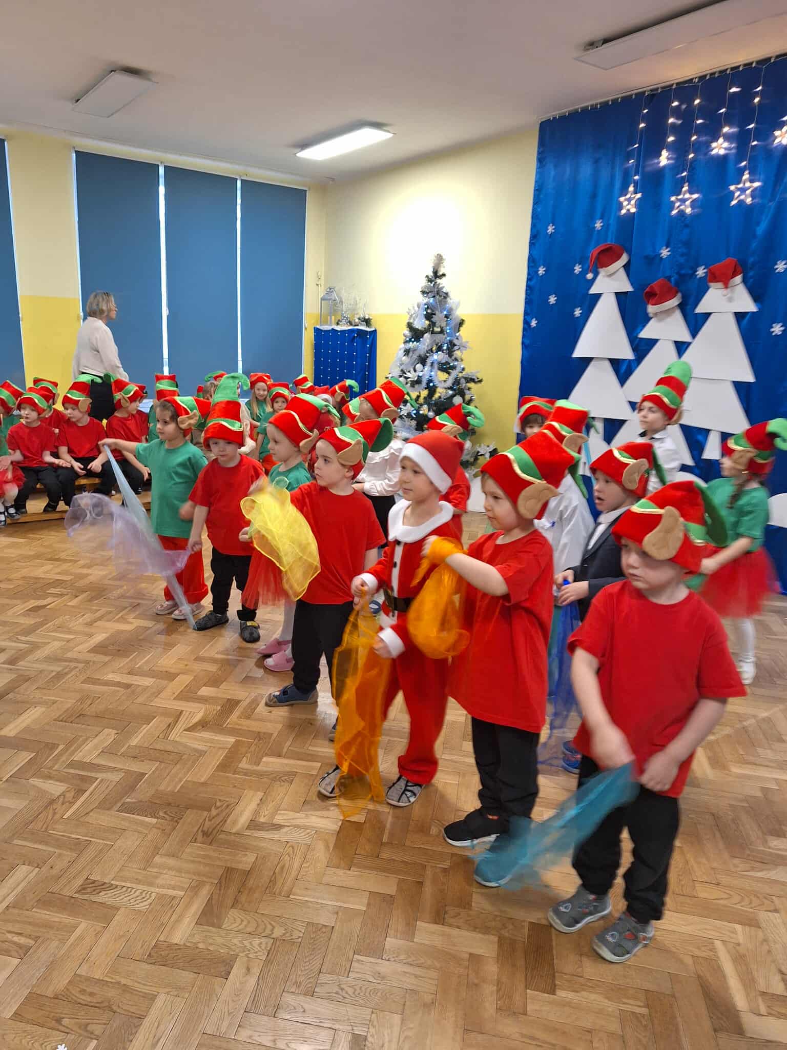 Z okazji zbliżających się Świąt Bożego Narodzenia 05.12.2025r w naszym przedszkolu odbyło się Świąteczne spotkanie z rodzicami. W gwarze przedświątecznych przygotowań, zatrzymaliśmy się na chwilę, aby nie przeoczyć istoty Świat Bożego Narodzenia. Wigilia w gronie przedszkolnej rodziny napełniła serca wszystkich obecnych niezwykłą radością i życzliwością. Bożonarodzeniowy klimat dopełniały świąteczne dekoracje w całym przedszkolu, lampki, świąteczne figurki oraz przystrojona choinka. Wszystkie dzieci zaprezentowały swoim najbliższym program artystyczny, w którym to z wielkim zaangażowaniem recytowały wiersze, tańczyły, śpiewały piosenki, grały na instrumentach muzycznych oraz składały świąteczne życzenia. Ogromną niespodzianką było spotkanie ze Świętym Mikołajem , który obdarował dzieci prezentami. Spotkanie świąteczne upłynęło w miłej i serdecznej atmosferze, z pewnością na długo pozostanie w naszej pamięci.
