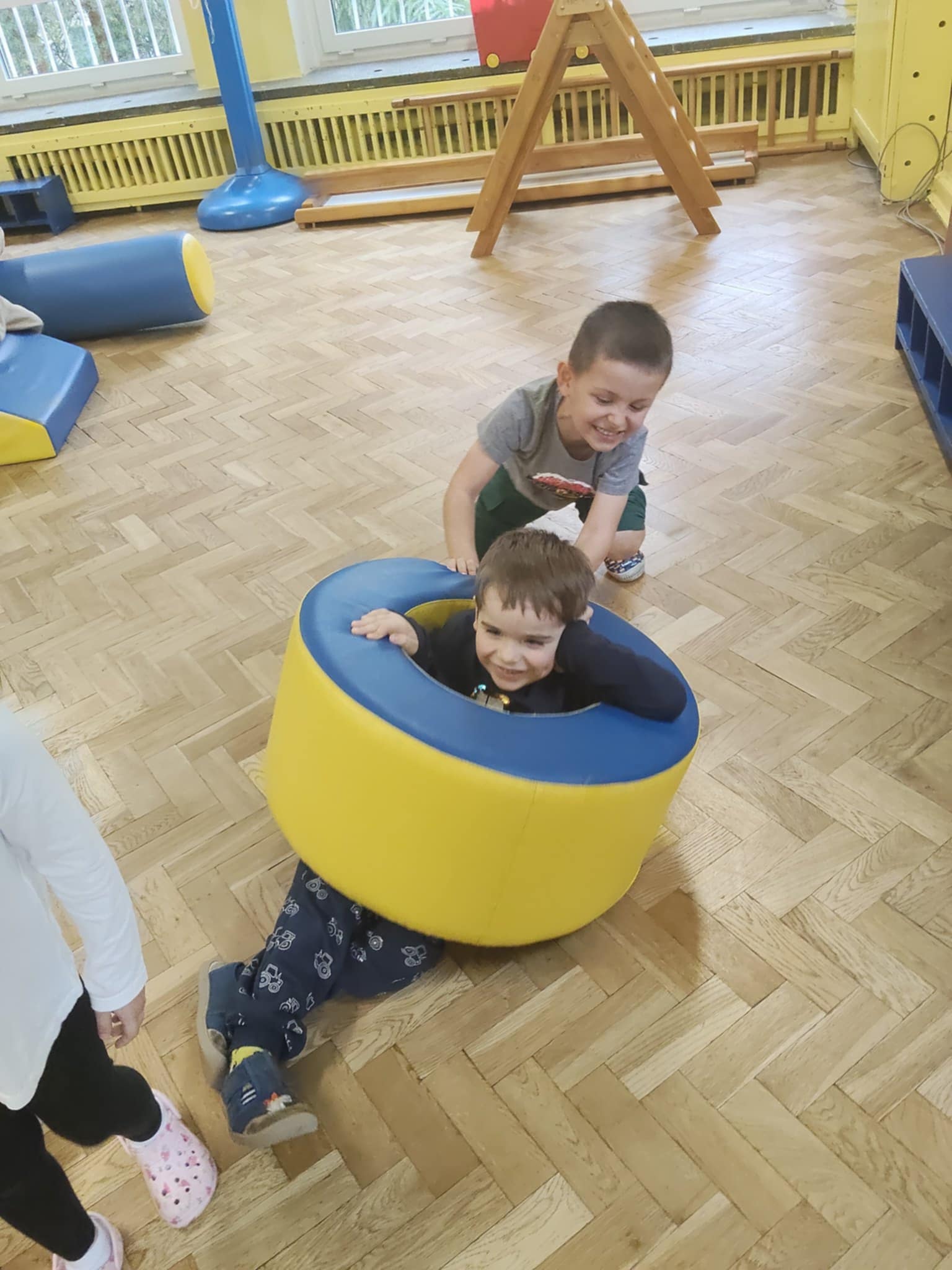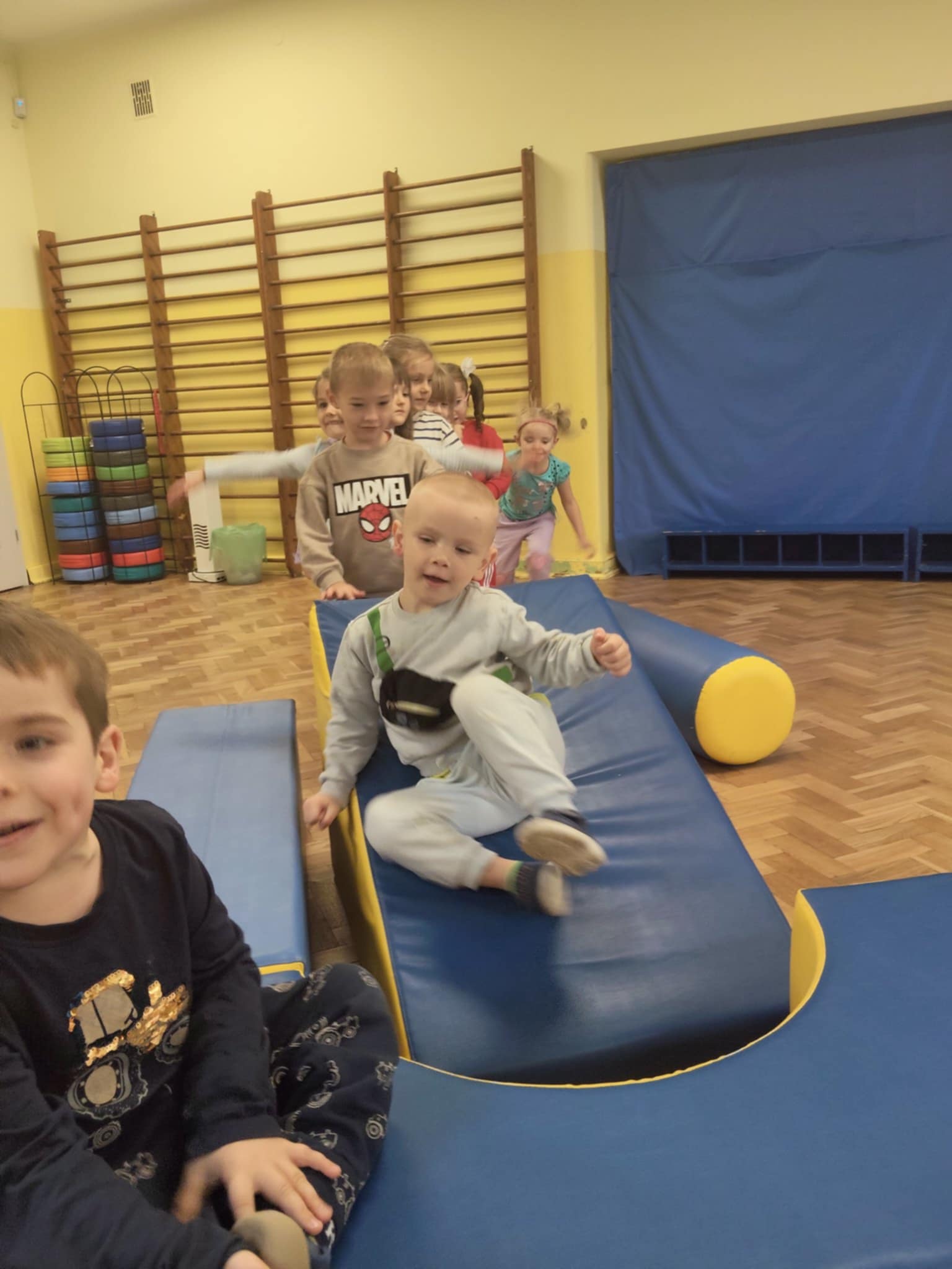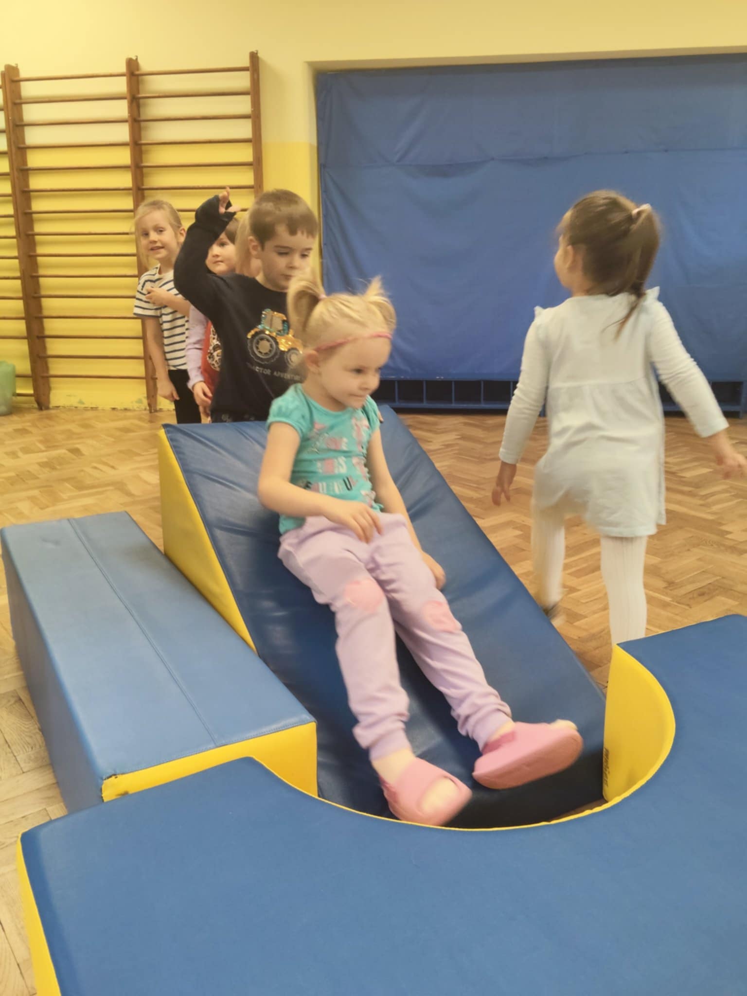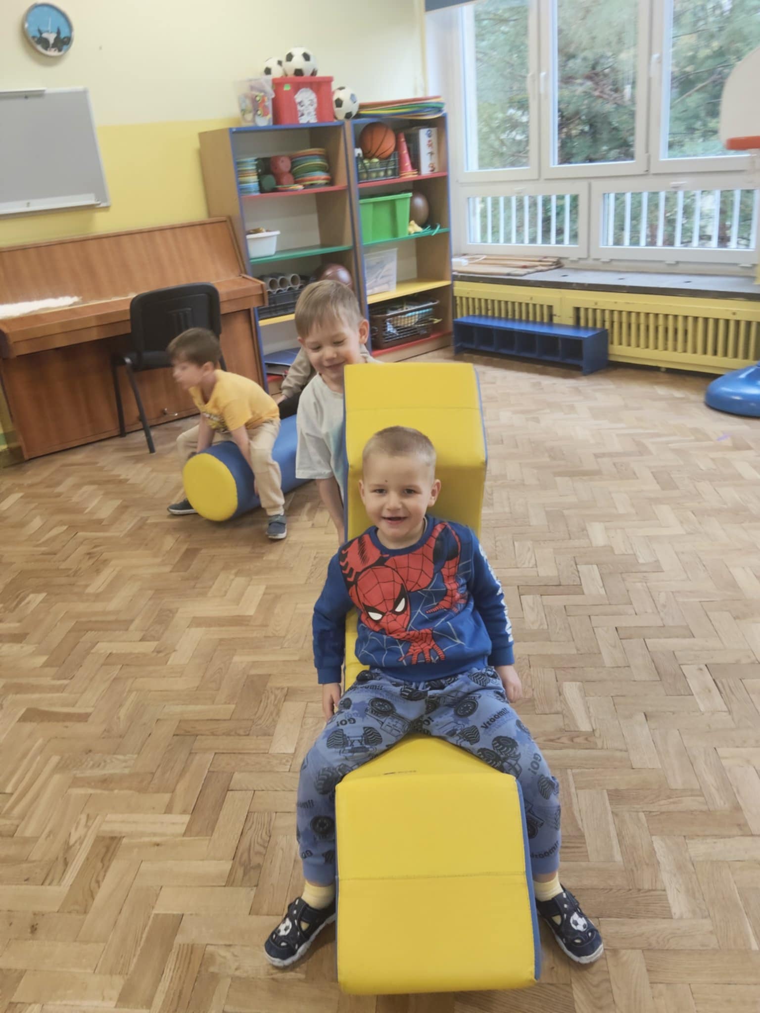 W zeszłym tygodniu bawiliśmy się na sali gimnastycznej. Okazało się, że pufy to super sprawa. Dzieciom bardzo podobał się tor przeszkód, który i tak po swojemu zmodyfikowały. Uśmiech z buzi nie schodził, a o to właśnie chodzi, żeby w przedszkolu była super zabawa.