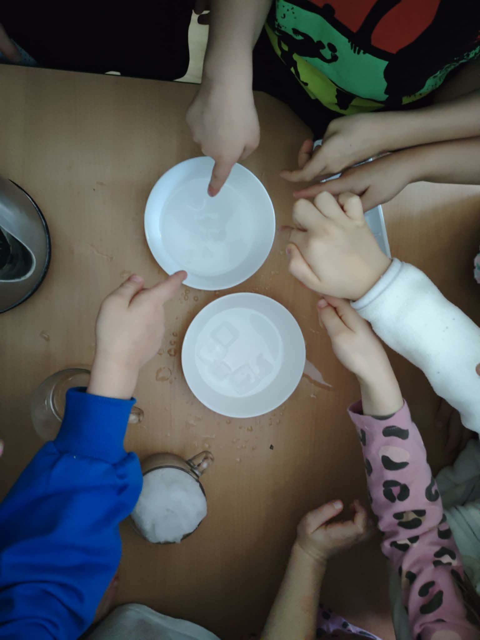 W dniu dzisiejszym dzieci z grupy 3 przeprowadzały zimowe zabawy badawcze, podczas których określały właściwości fizyczne wody, śniegu i lodu. W tracie doświadczeń dowiedziały się dlaczego woda zmienia się w parę wodną. Obserwowały jak zachowują się kostki lodu w zimnej a jak gorącej wodzie. Poszukiwały odpowiedzi na pytanie "Czy śnieg jest czysty?".